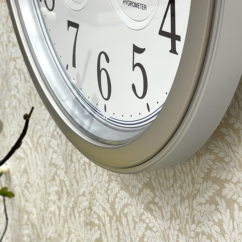 Mua tại TiktokĐồng hồ treo tường Rhythm, dùng pin (AAx1), vỏ nhựa cao cấp màu tráng, có 2 đồng hồ nhỏ thể hiện nhiệt độ và độ ẩm. . Kích thước 33.0 x 4.7cm, trọng lượng 760g