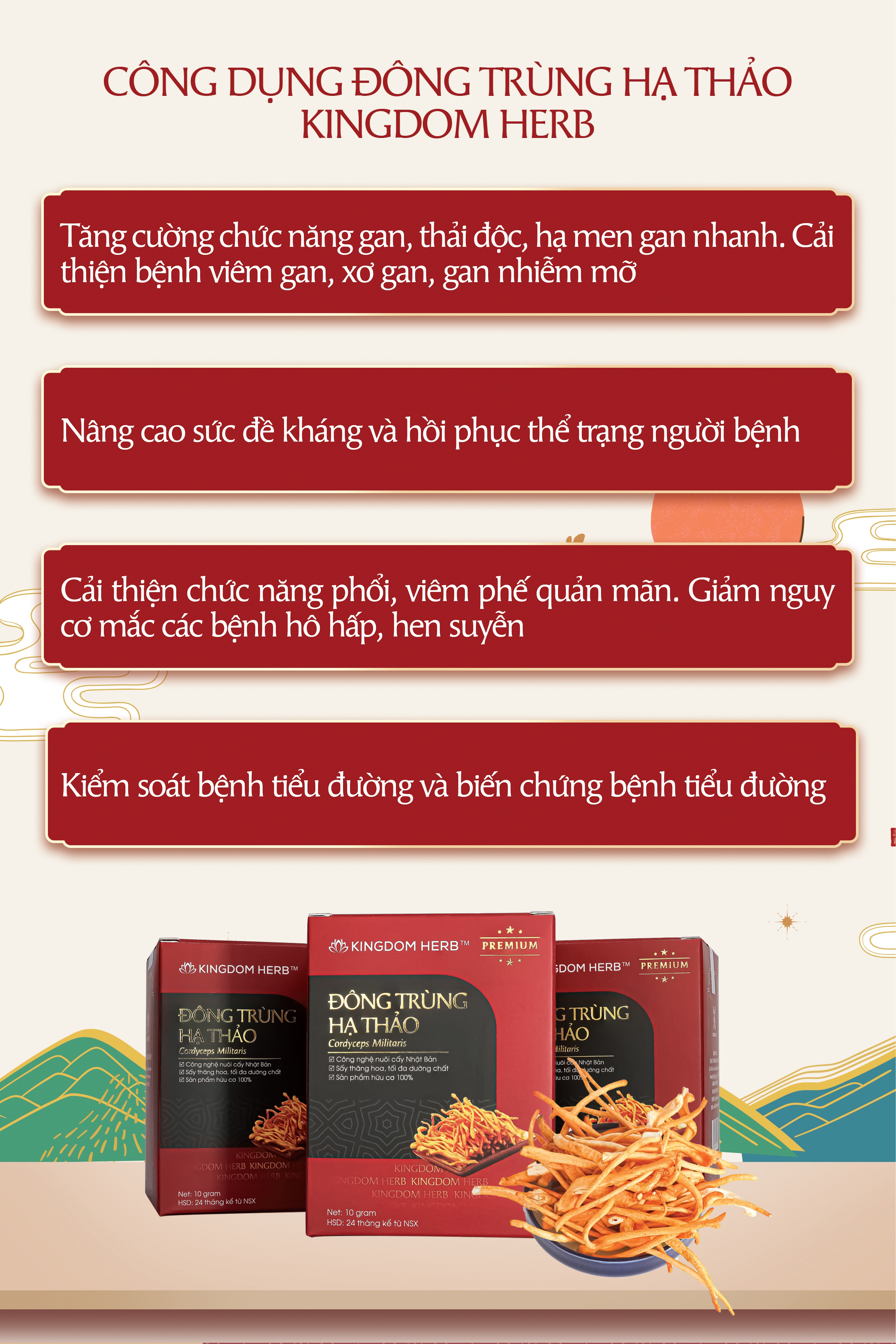 - Sản phẩm thương hiệu Kingdom Herb uy tín và luôn đặt chất lượng lên hàng đầu Công dụng đông trùng hạ thảo sấy khô Kingdom Herb: