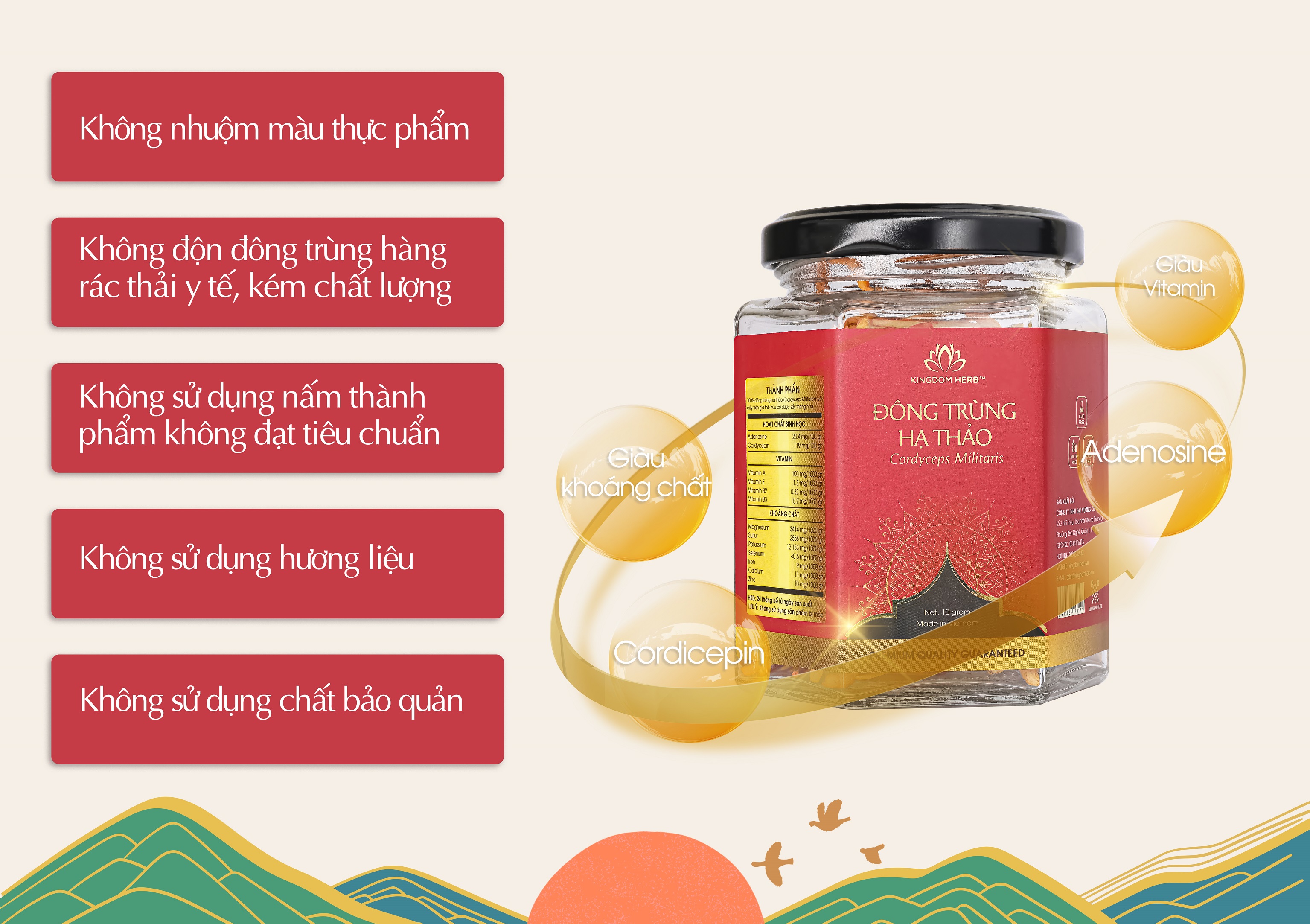 - Nói không với hàng trôi nổi trên thị trường Đông trùng hạ thảo sấy khô Kingdom Herb đảm bảo 5 KHÔNG: