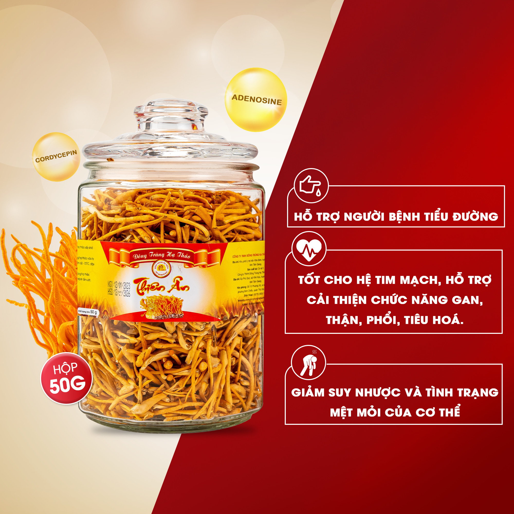 Mua tại TiktokĐông trùng hạ thảo sấy thăng hoa Thiên Ân 50 gram là sản phẩm được sấy thăng hoa từ đông trùng hạ thảo tươi, đảm bảo giữ được 99% hàm lượng dược chất. Quy cách đóng gói: Hũ thủy tinh 50g Sản phẩm được cấp chứng nhận Hàng Việt Nam Chất Lượng Cao do Hội Doanh Nghiệp Hàng Việt Nam Chất Lượng Cao cấp. Sản phẩm đạt tiêu chuẩn FDA xuất khẩu sang Mỹ