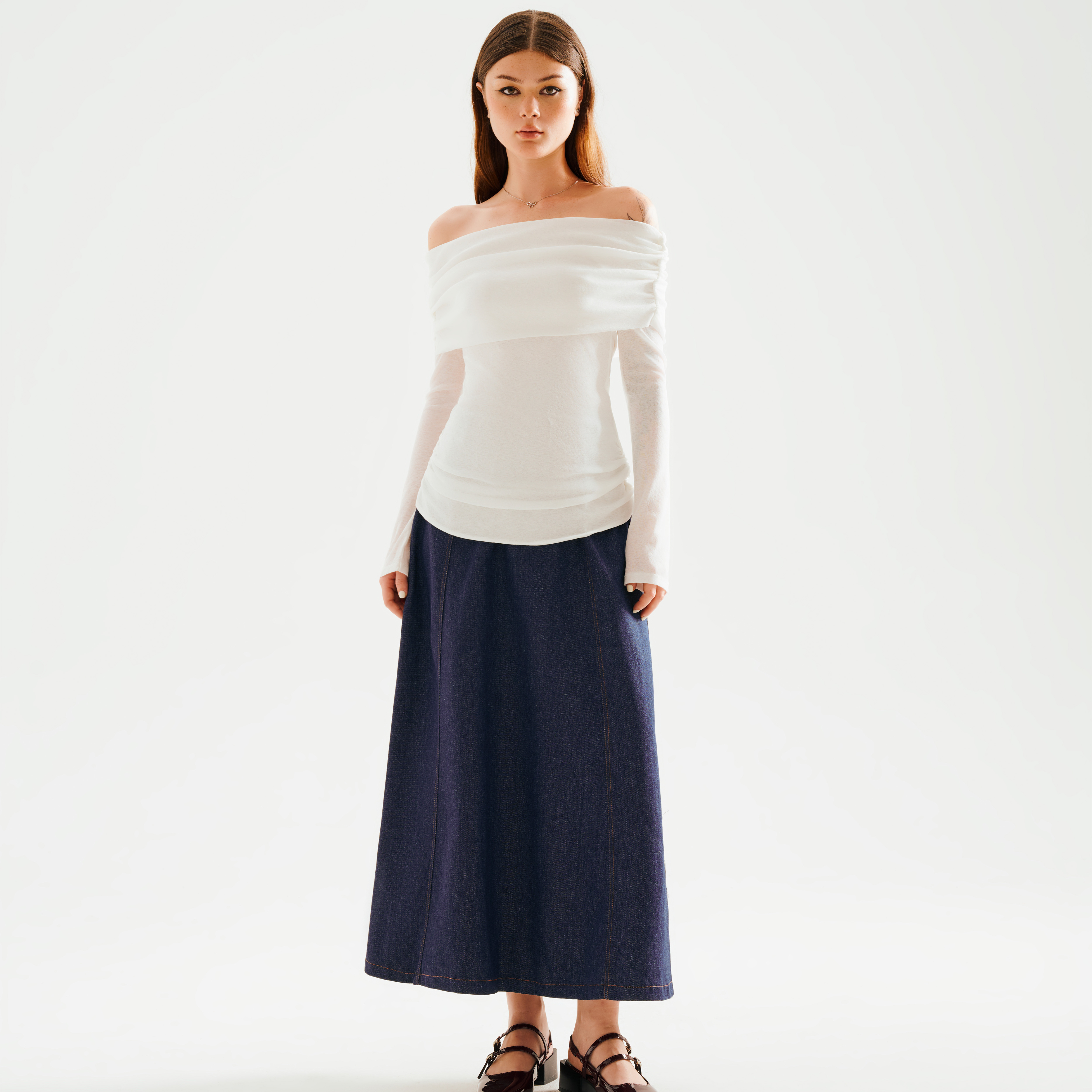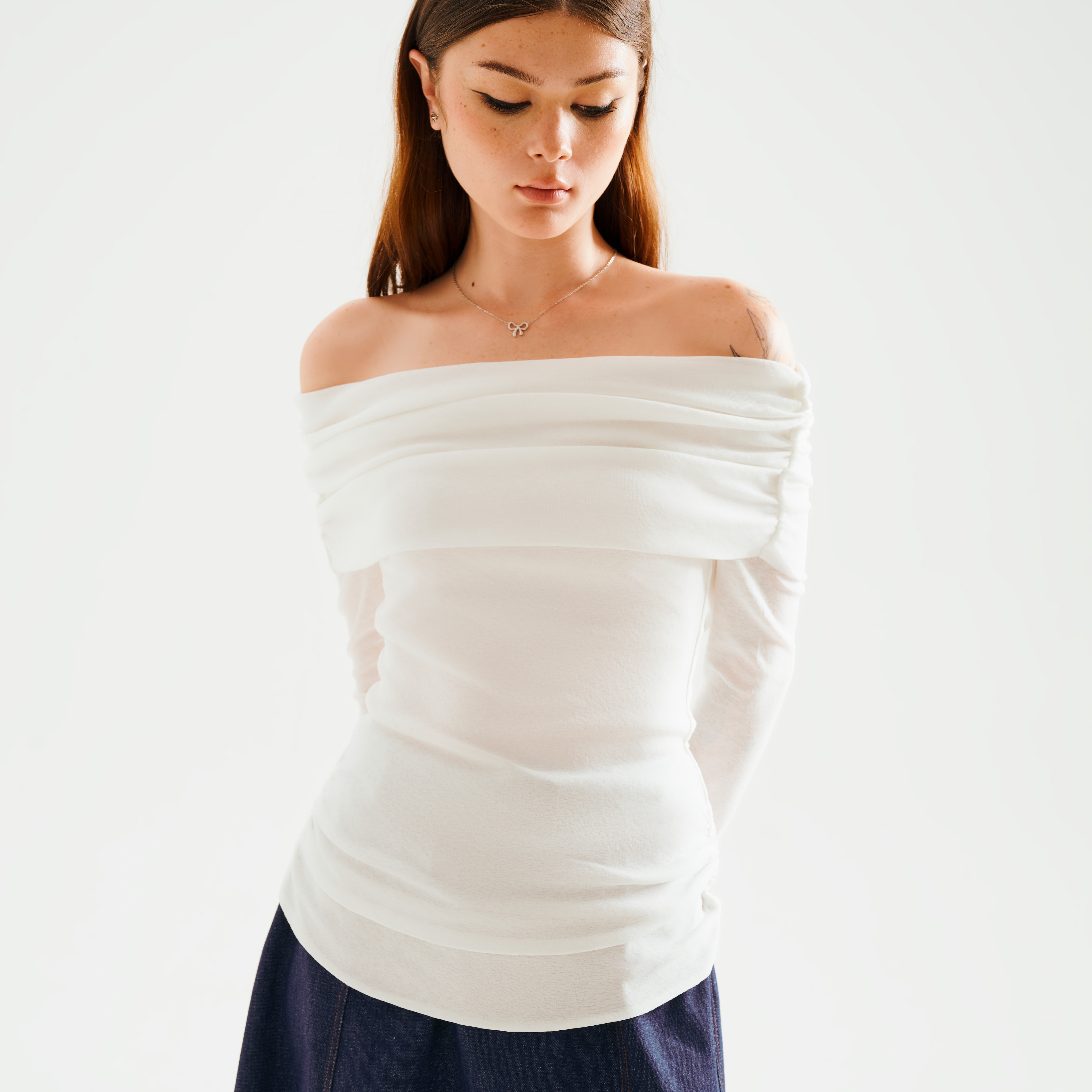 CHI TIẾT SẢN PHẨM - Sản phẩm : Áo nữ tay ngắn kiểu trễ vai chất liệu thích hợp mùa hè Muriel Miều Est.2013 - Chất liệu : Thun Cát - Màu sắc : KEM
