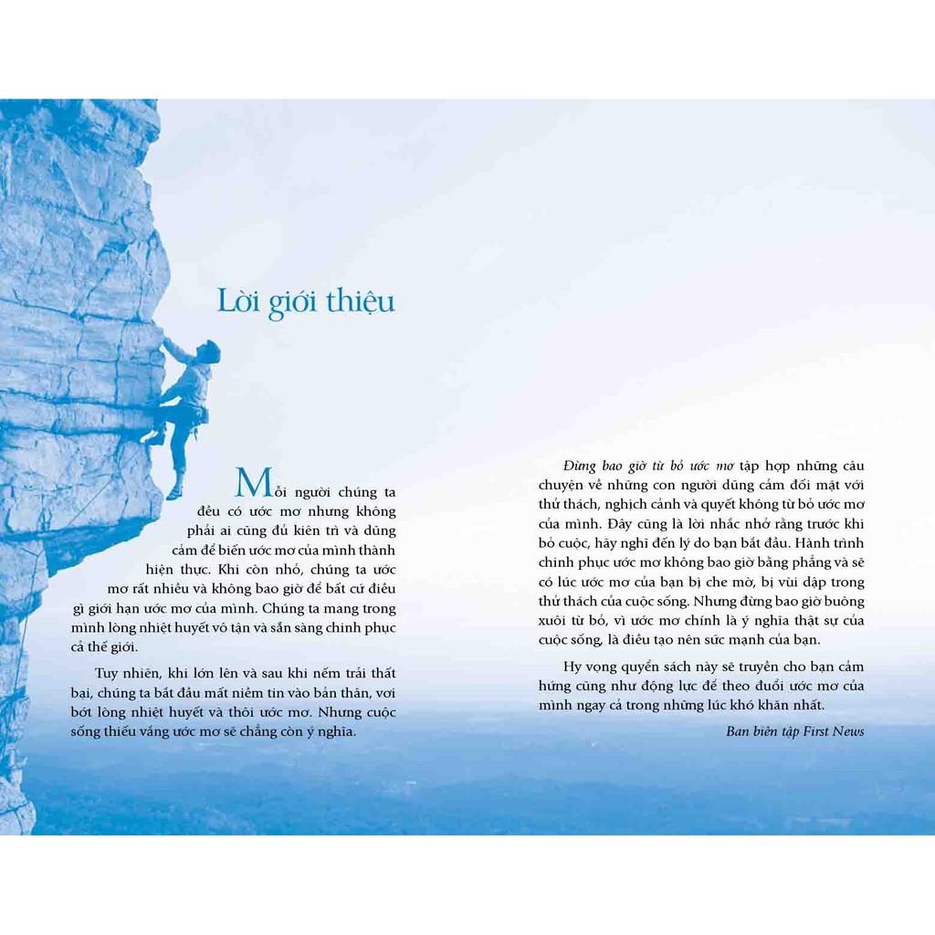 Đừng bao giờ từ bỏ ước mơ là tập hợp những câu chuyện về những con người dũng cảm đối mặt với thử thách, nghịch cảnh và quyết không từ bỏ ước mơ của mình. Đây cũng là lời nhắc nhở rằng trước khi bỏ cuộc, hãy nghĩ đến lý do bạn bắt đầu.
