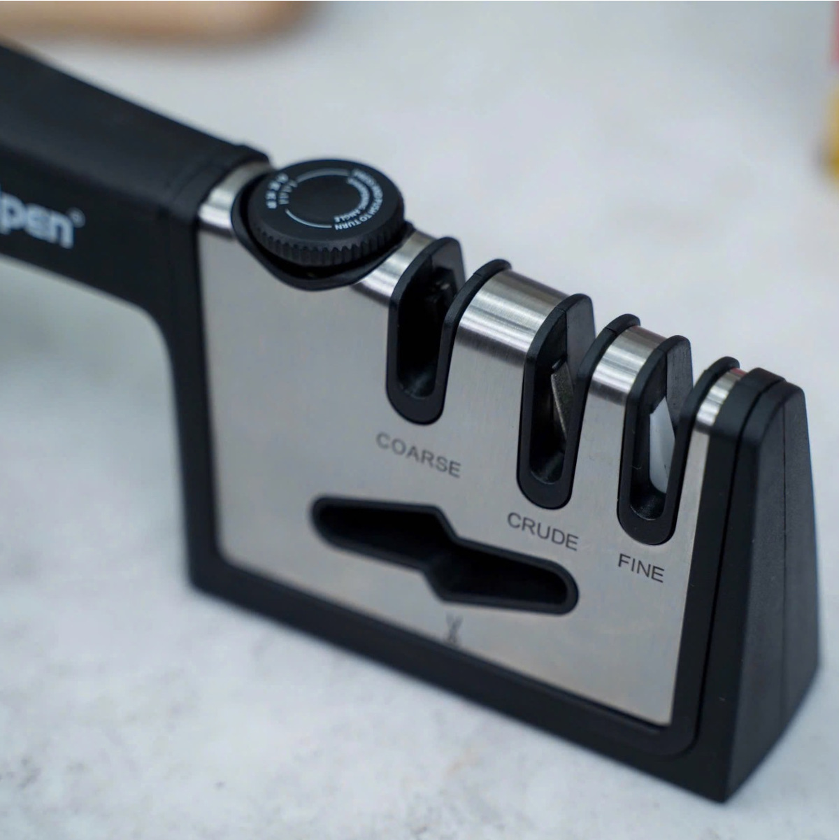 • Điều chỉnh góc mài thông minh Có thể chỉnh góc mài chính là một trong những đặc điểm nổi bật của dụng cụ mài dao kéo đa năng Kalpen. Nút điều chỉnh góc mài có khả  năng điều chỉnh góc mài ở mức 19 đến 40 độ, người dùng dễ dàng tùy chỉnh để phù hợp với các loại dao khác nhau từ dao bếp truyền thống đến những loại dao chuyên dụng như dao băm chặt hay dao gọt trái cây…