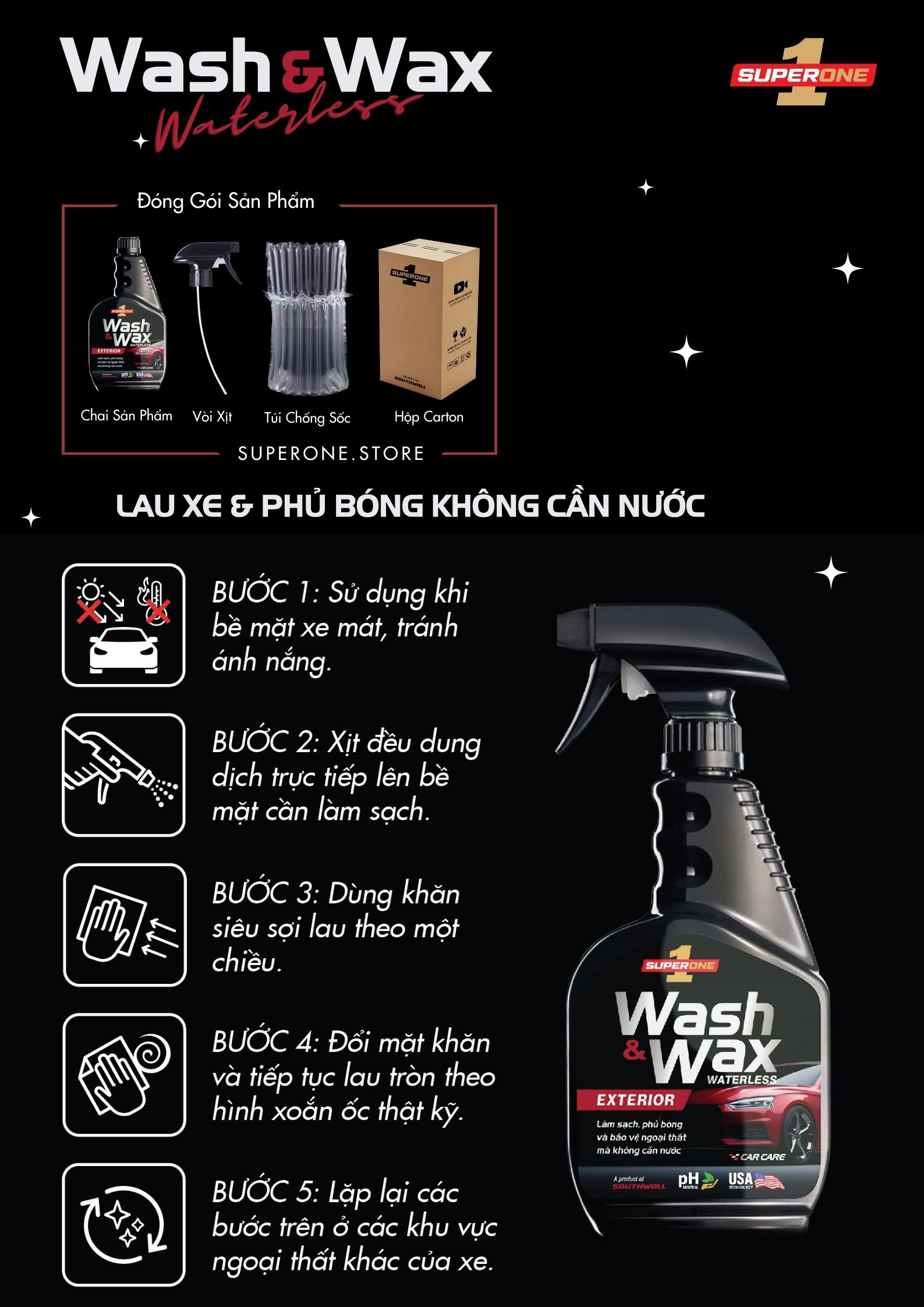 LÀM SẠCH, PHỦ BÓNG VÀ BẢO VỆ NGOẠI THẤT MÀ KHÔNG CẦN NƯỚC   Dung Dịch Lau Xe Và Phủ Bóng Ngoại Thất Không Cần Nước Super One Waterless Wash And Wax – Exterior nhẹ nhàng rửa sạch, tạo bóng và bảo vệ ngoại thất ô tô chỉ trong một bước dễ dàng. Sử dụng an toàn và hiệu quả gần như ở bất cứ bề mặt nào như sơn, nhựa, cao su, mạ crôm và kim loại. Công thức tiên tiến với lớp phủ bóng bề mặt xe, bảo vệ lâu dài hàng tuần. Sử dụng dễ dàng, nhanh chóng và không gây trầy xước hay mài mòn bề mặt vật liệu. Sản phẩm lý tưởng sử dụng cho các khu vực bị hạn chế tiếp cận nguồn nước như thành phố, căn hộ hoặc nước bị nhiễm phèn mặn.   Đặc Tính Sản Phẩm