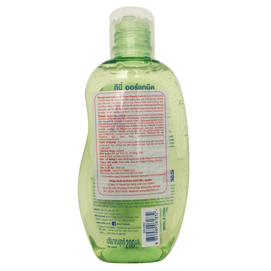 - Dnee xanh lá là dòng sữa tắm chuyên dùng cho da thường. Sản phẩm có nồng độ PH cân bằng, giúp lưu giữ độ ẩm tự nhiên của làn da bé. Sữa tắm gội toàn thân em bé Dnee xanh lá chiết xuất từ 7 thành phần tự nhiên. Các chiết xuất hữu cơ trên đã được chứng minh có khả năng nuôi dưỡng làn da và mái tóc bé. an toàn đối với trẻ nhỏ.