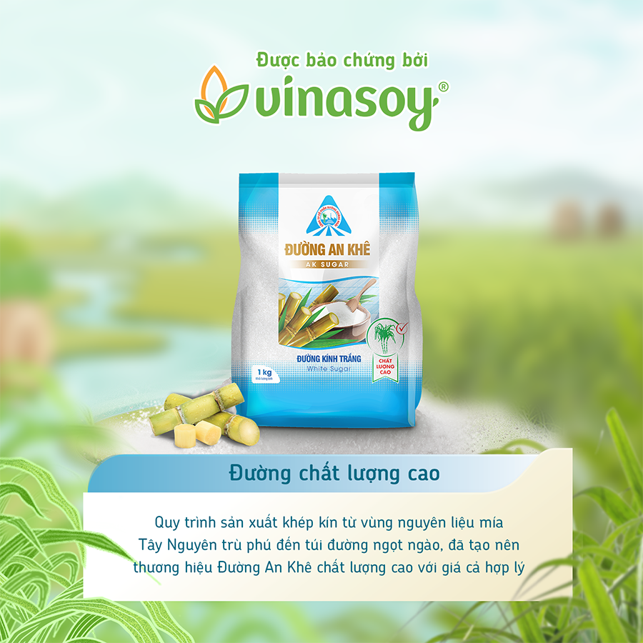- Đường An Khê được sản xuất bên trong hệ sinh thái khép kín giữa vùng nguyên liệu - nhà máy đường - điện sinh khối, giúp tạo thành những hạt đường to đều có độ tinh khiết cao với giá cả phải chăng.