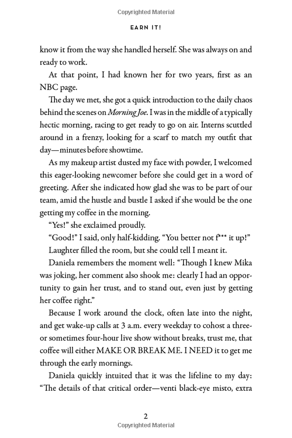 The whirlwind of job applications, interviews, follow-up, resume building, and networking is just the beginning. What happens after you've landed the job, settled in, and begun to make a difference-where do you go from here? What if you feel stuck in what you thought would be your dream profession? New York Times bestselling author Mika Brzezinski and producer Daniela Pierre-Bravo provide an essential manual for those crucial next steps. Earn It! is a practical career guidebook that not only helps you get your foot in the door; it also shows you how to negotiate a raise, advocate for more responsibility, and figure out whether you're in the career that's right for you.