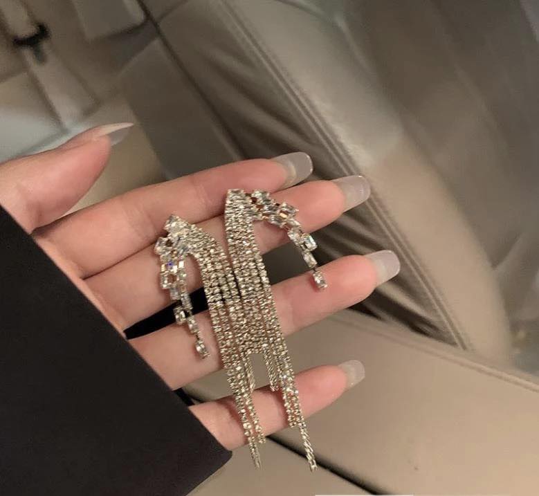 Earrings đeo tai nữ dáng dài tua rua đính đá lấp lánh • Chất liệu: Hợp kim cao cấp an toàn với da. • Thiết kế tinh xảo, đẳng cấp và style trẻ trung, thời