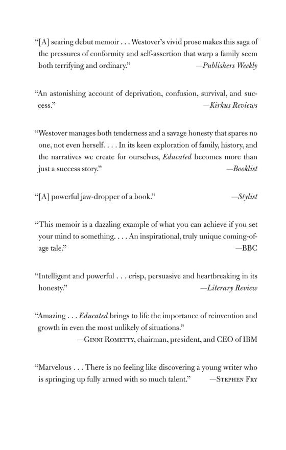 "Beautiful and propulsive . . . Despite the singularity of [Westover's] childhood, the questions her book poses are universal: How much of ourselves should we give to those we love? And how much must we betray them to grow up?"--Vogue