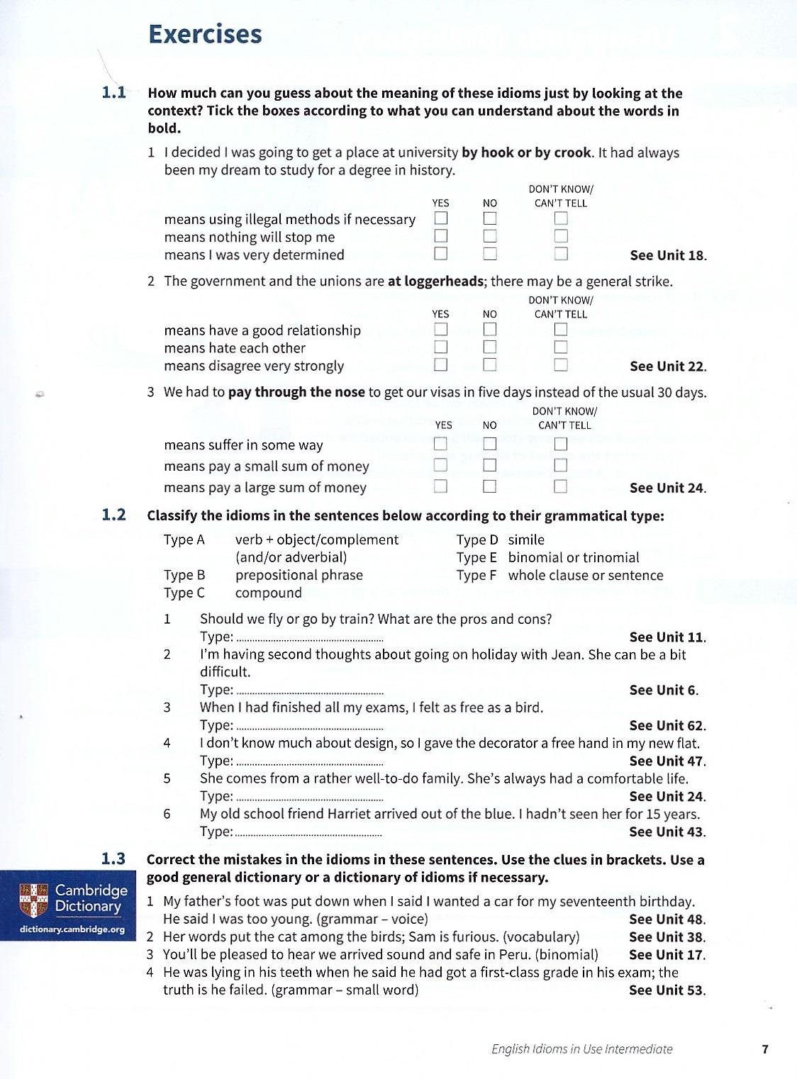 Improve your understanding of idioms in English. Explanations and practice of English idioms, written for intermediate-level (B1 to B2) learners of English. Perfect for both self-study and classroom activities. Learn idioms in context, with lots of different topics, including 'Clothes', 'Music and theatre' and 'Work'. Be confident about what you are learning, thanks to Cambridge research into how English is really spoken and written, and get better at studying by yourself, with study tips, follow-up tasks and an easy to use answer key.