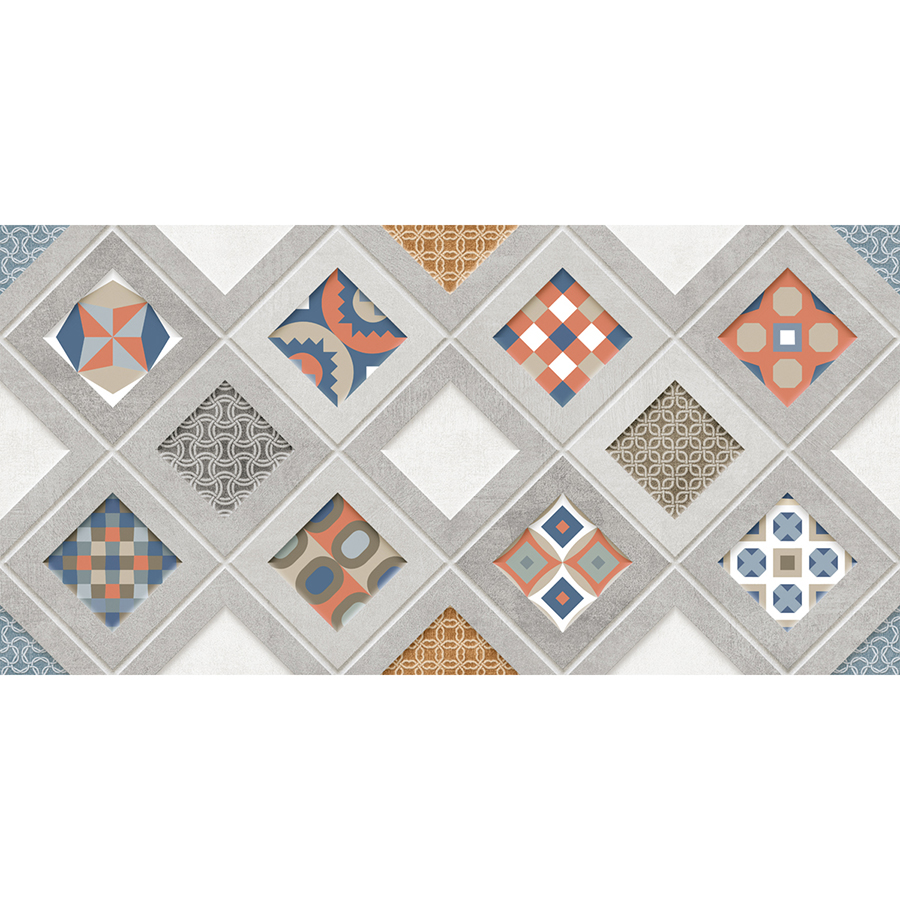 Họa tiết của gạch ốp tường là sự kết hợp giữa các tone màu xanh lam, đỏ, be, xám, trắng và nâu tạo nên một gam màu tổng thể rực rỡ và bắt mắt, nổi bật khi ốp tường trang trí. Bên cạnh đó, họa tiết là những khối hình 2D xếp trong khối vuông tạo nên những hoa văn tối giản và hiện đại giúp hài hòa và tăng tính sinh động cho không gian nội thất xung quanh.