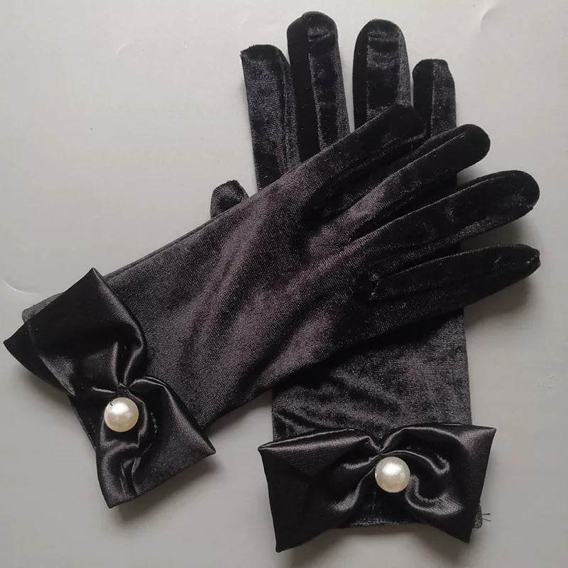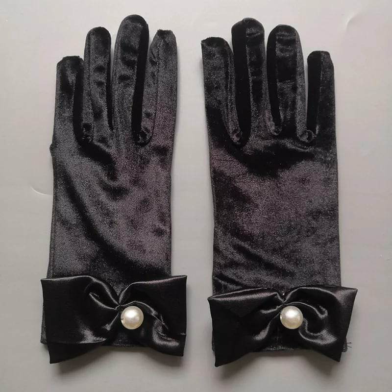 Găng tay Cô dâu và Dạ hội, đi tiệc, sự kiện. MS: 45451. Chất liệu: nhung, co giãn. Kiểu dáng: bao kín ngón, ôm tay, đính nơ và ngọc trai. Hoạ tiết: trơn. Độ dài: