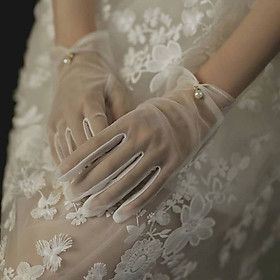 Găng tay Cô dâu và Dạ hội, đi tiệc, sự kiện, lễ hội, chụp ảnh MS: 43445 Chất liệu: tuyn mềm. Kiểu dáng: bao kín ngón, trong suốt, tạo kiểu và đính hạt trai ở
