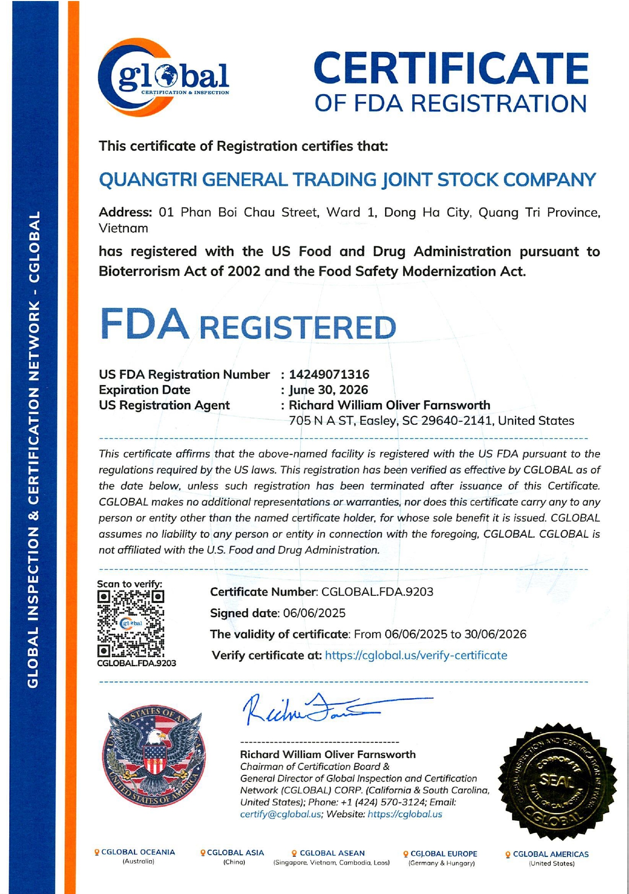 - Cơ sở sản xuất đã đăng ký FDA của Mỹ (Giấy chứng nhận FDA đính kèm)