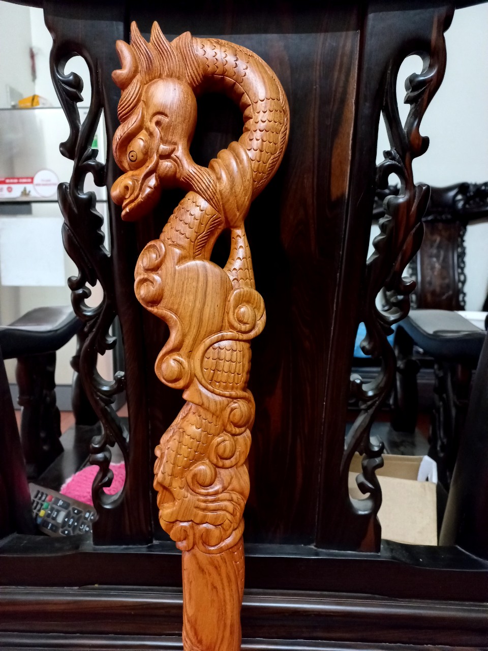 Đặc điểm nổi bật Gậy được khắc rồng cuốn từ đầu xuống chân tỉ mỉ ,tinh xảo kỳ công .Đi hầu hết tất cả mọi chi tiết góc ngách nội dung hoa văn của gậy