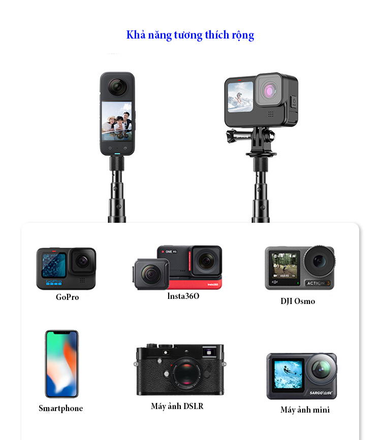 - Thiết kế 5 phần gậy selfie cho camera hành động có thể nối dài từ 27.9cm/11inch đến 113.5cm/44.7inch linh hoạt.