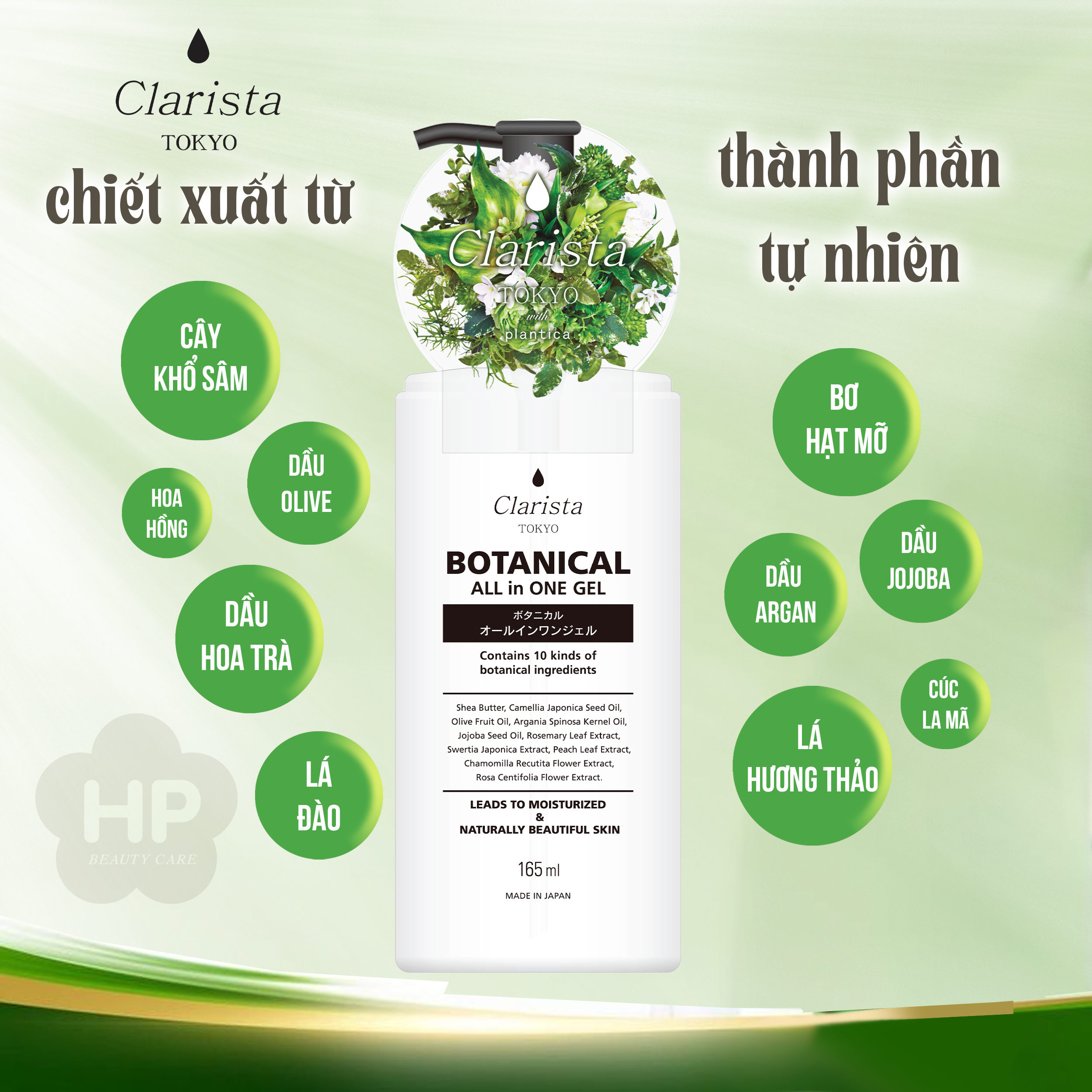 Gel Dưỡng Ẩm Trắng Sáng Da Clarista Tokyo Botanical All In One Gel (165 mL) Thương hiệu: Clarista Xuất xứ: Nhật Bản Thể tích thực: 165ml HSD: 3 năm kể từ ngày sản xuất Mã