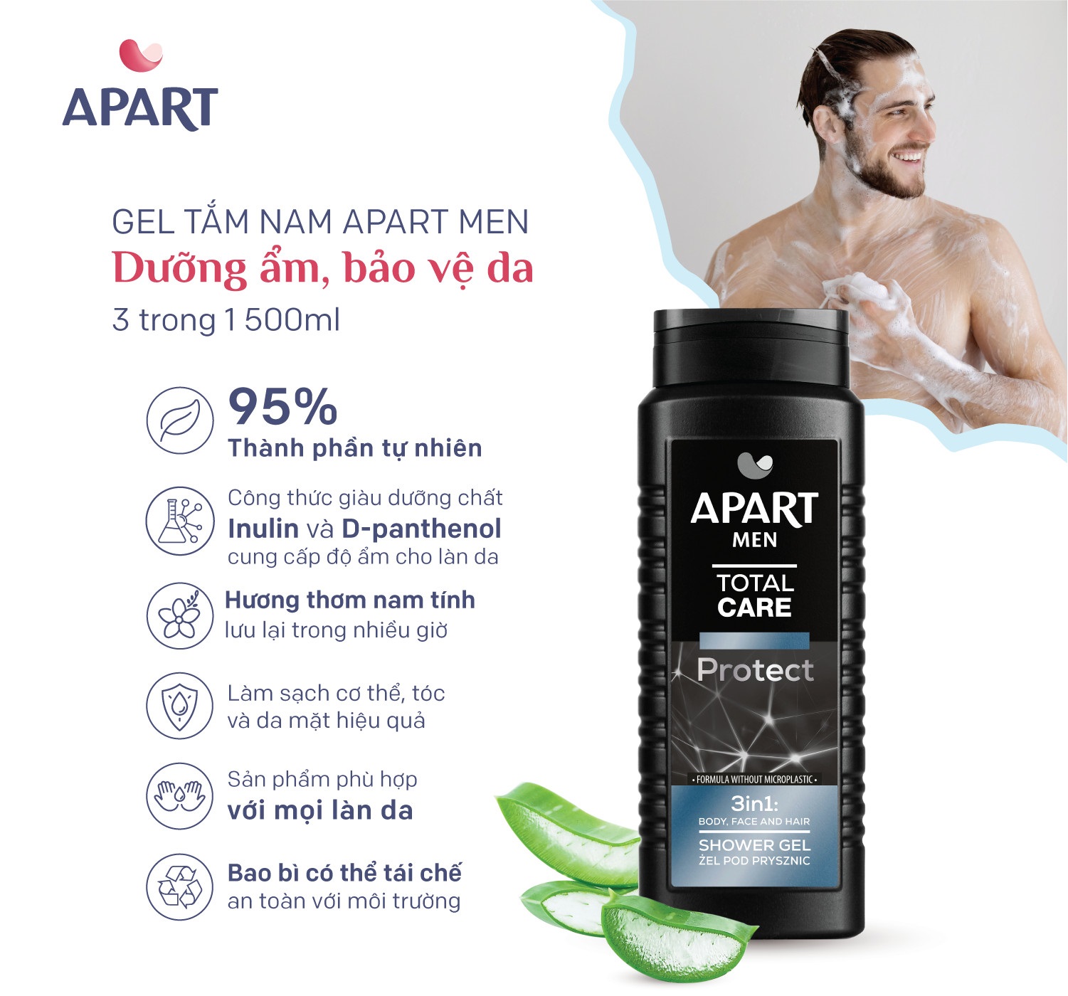 Mua tại TiktokDung tích: 500ML Thương hiệu: Apart Xuất xứ: Ba Lan Loại da phù hợp: Sản phẩm phù hợp cho mọi loại da, phù hợp nhất với da khô và nhạy cảm. Thành phần: Aqua, Sodium Laureth Sulfate, Sodium Chloride, Cocamidopropyl Betaine, Coco-Glucoside, Glyceryl Oleate, Tocopherol, Hydrogenated Palm Glycerides Citrate, Glycol Distearate, Glycerin, Inulin,Panthenol, Parfum, Limonene, Linalool, Citric Acid, Sodium Benzoate, Potassium Sorbate. Công dụng: Làm sạch cơ thể, dưỡng ẩm da nhẹ nhàng và mang đến cho phái mạnh hương thơm nam tính. Hướng dẫn sử dụng: Cho một lượng sản phẩm thích hợp vào bông hoặc khăn tắm rồi tạo bọt. Massage toàn thân và tắm sạch với nước. Bảo quản: Bảo quản nơi thoáng mát, tránh ánh nắng trực tiếp của mặt trời.