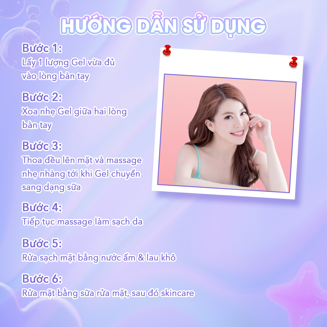 - Tẩy trang hiệu quả nhưng không làm khô da: Cleansing Gel có khả năng loại bỏ mọi lớp trang điểm và bụi bẩn một cách nhẹ nhàng mà không làm da khô, căng hay mất đi độ ẩm tự nhiên, giúp da luôn mềm mại và sạch sẽ. HƯỚNG DẪN SỬ DỤNG