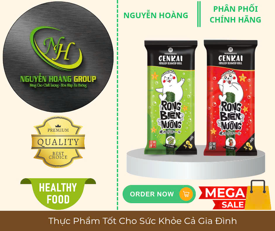 Tên sản phẩm: RONG BIỂN NƯỚNG CUỘN Có 2 Vị : Tự Nhiên & Vị Cay NÓNG Thành phần: Rong biển 68%, dầu ngô 26.7%, dầu mè 4.3%, muối biển 1% Lá Rong biển có