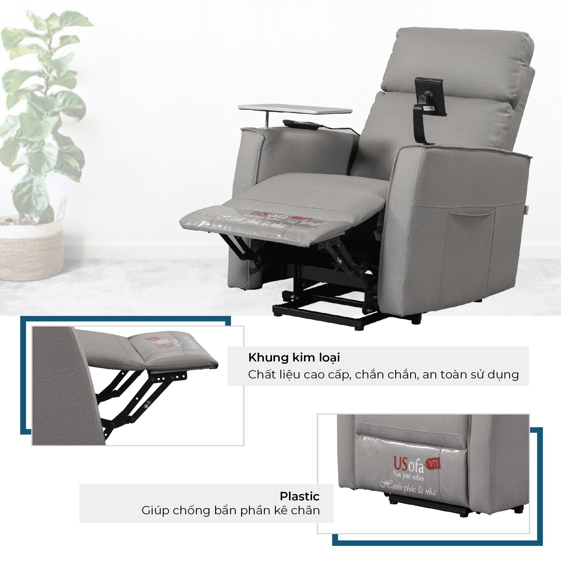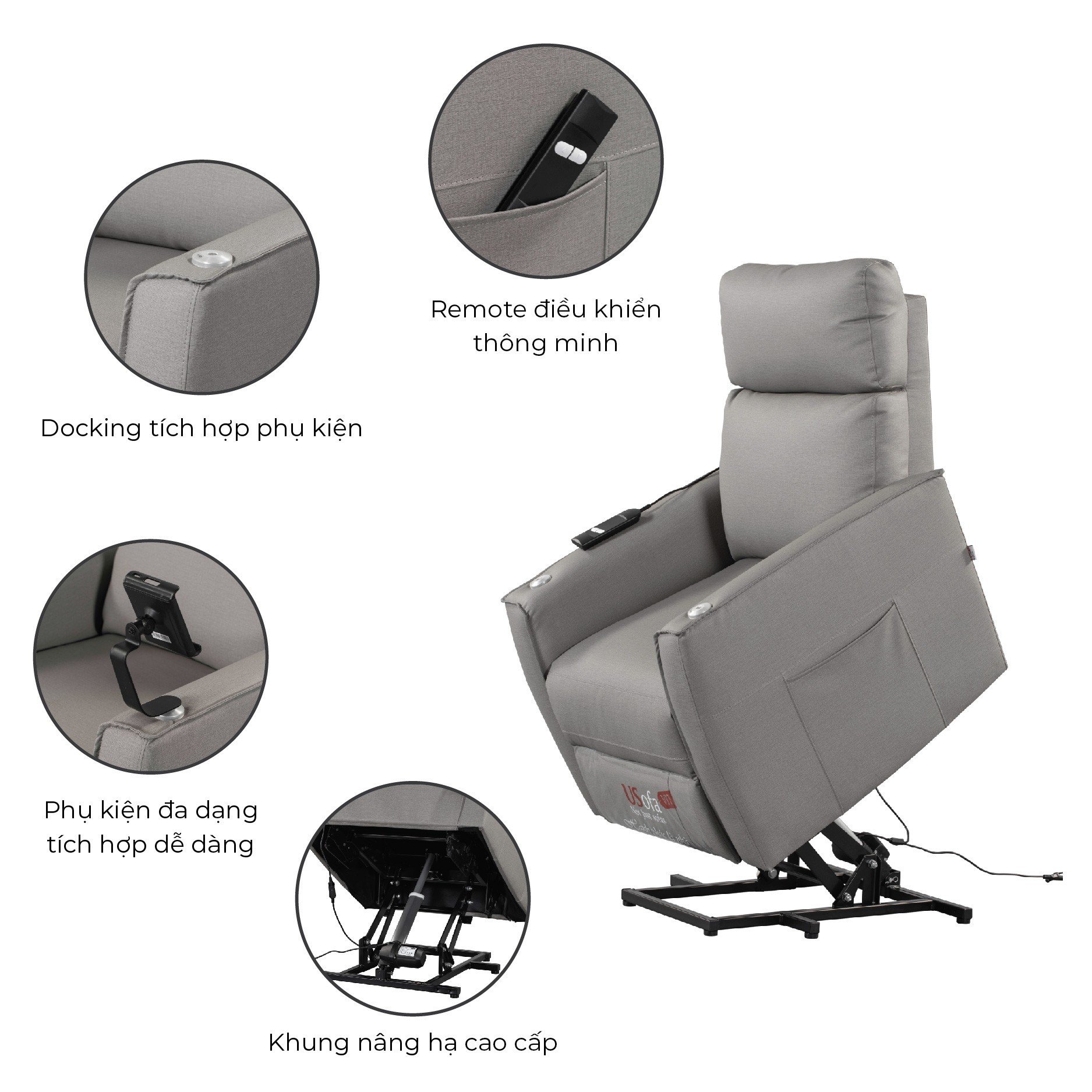 - Đặc trưng Ghế có thể nâng lên, hỗ trợ người cao tuổi đứng lên dễ dàng. Ghế hạ xuống dễ dàng, ôm lưng, vải da êm ái dịu dàng. Ghế ngã ra giúp người dùng có thể thư giãn trong thời gian dài. Thư giãn, giải trí dễ dàng với phụ kiện hỗ trợ.