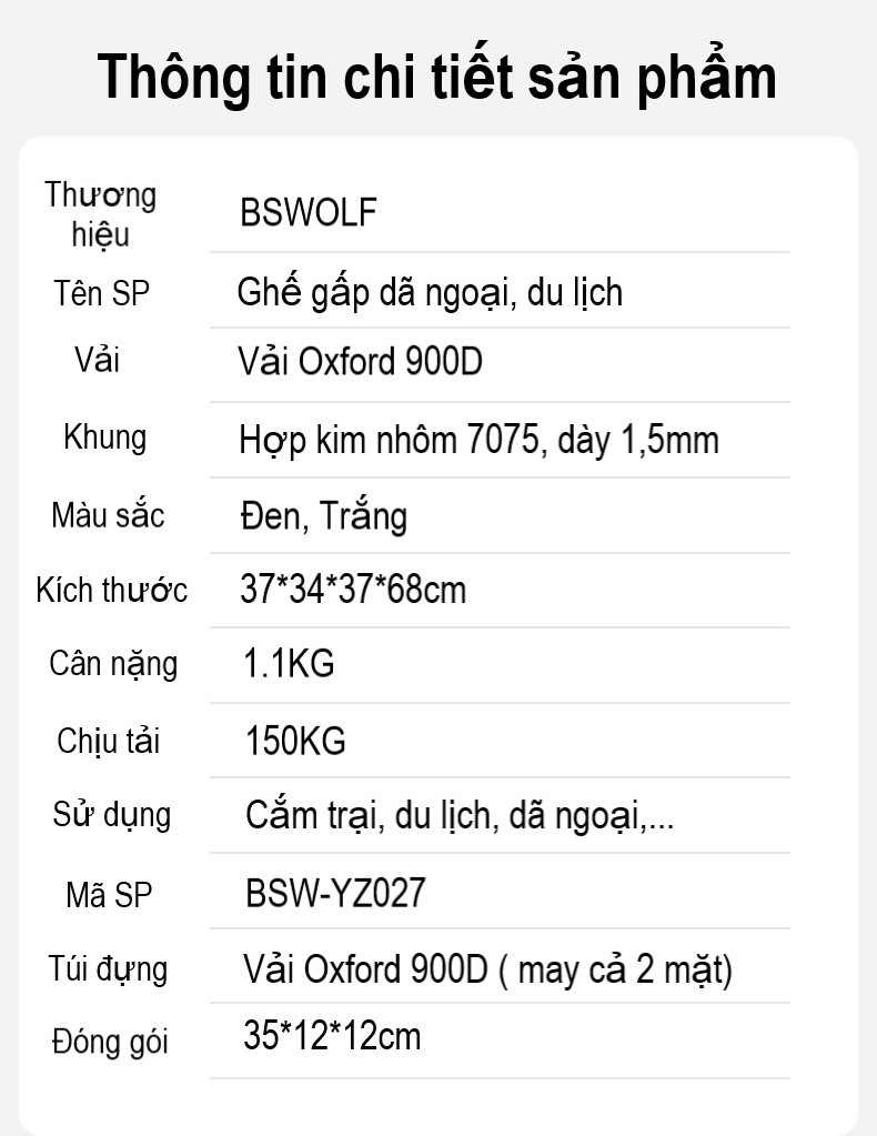 ------ Ghế Ngồi gập gọn được làm từ Chất liệu khung hợp kim nhôm sơn tĩnh điện siêu cứng, mặt ngồi bằng vải 600D Oxford cao cấp siêu êm. Khung hợp kim cứng giúp ghế