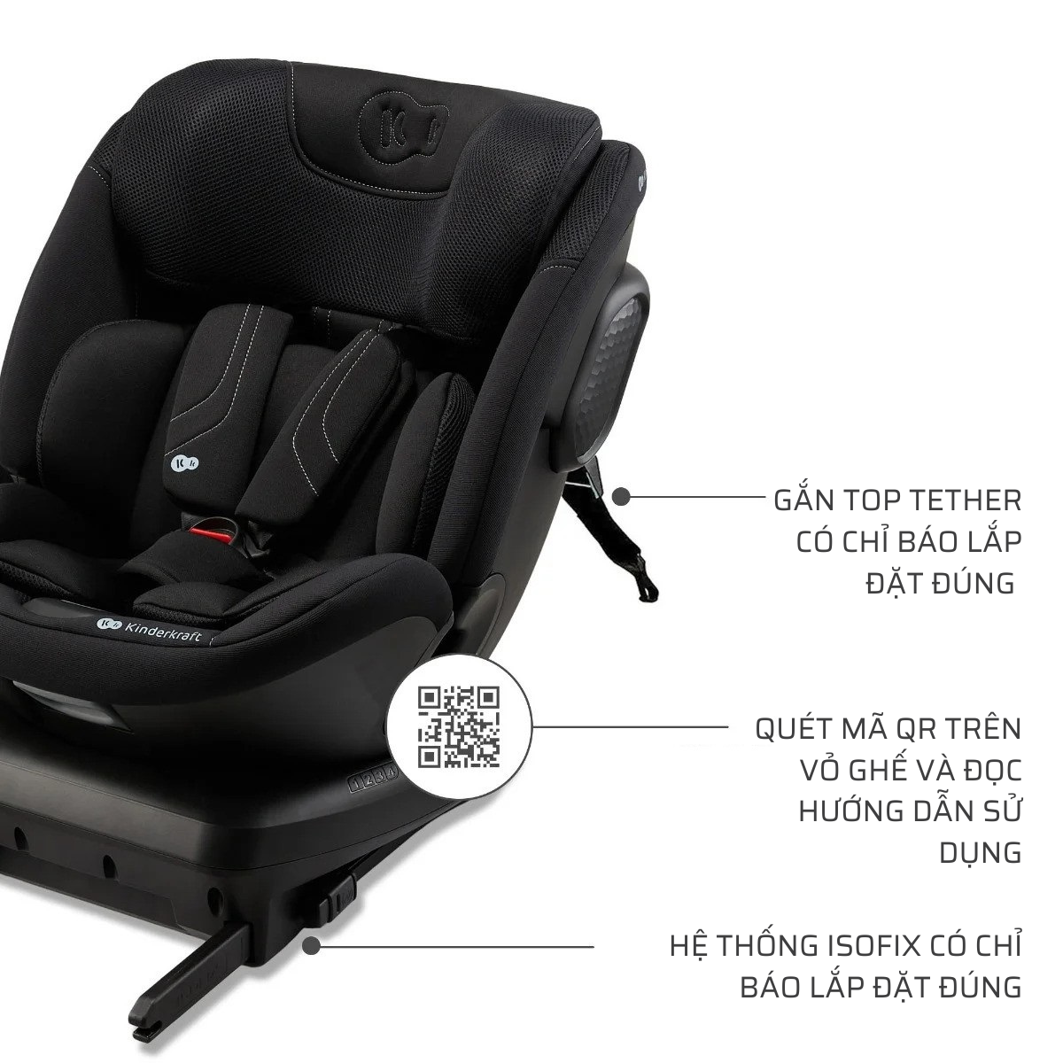 • Các chỉ báo hiển thị hướng dẫn cách lắp ISOFIX và TOP TETHER (Có sẳn hướng dẫn lắp ráp bằng cách quét mã QR trên vỏ ghế)