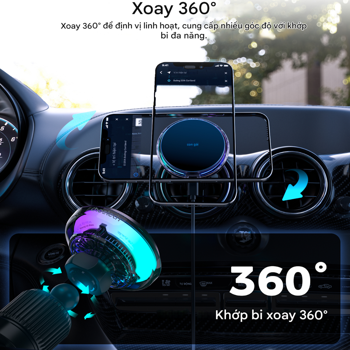 - Gắn khe gió linh hoạt – Thiết kế xoay 360° – Chân đế được thiết kế chống trượt, chống rung khi gắn vào khe gió của ô tô, phù hợp với đa số các loại xe hiện nay. – Đầu xoay linh hoạt 360 độ giúp bạn dễ dàng điều chỉnh góc nhìn tối ưu, đảm bảo an toàn và tiện lợi khi sử dụng bản đồ hoặc nghe gọi.