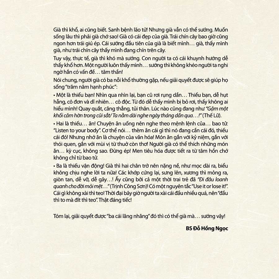 Với tác phẩm Già Sao Cho Sướng? - Để Có Một Tuổi Già Hạnh Phúc, bác sĩ Đỗ Hồng Ngọc đã dùng cách viết dí dỏm để “chữa” thân bệnh, tâm bệnh cho các “bệnh nhân” ở tuổi xế chiều, “để có một tuổi già hạnh phúc”. Già thì khổ, ai cũng biết. Sanh lão bệnh tử. Nhưng già vẫn có thể sướng. Muốn sống lâu thì phải già chớ sao! Già có cái đẹp của già. Trái chín cây bao giờ cũng ngon hơn trái giú ép. Cái sướng đầu tiên của già là biết mình… già, thấy mình già, như trái chín cây thấy mình đang chín trên cây.