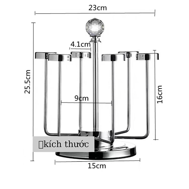 Kích thước giá để cốc nhỏ gọn tiện dụng, thích hợp để bạn trang trí bàn uống nước, bàn ăn… Sản phẩm Rộng 23.5cm x Cao 25.5cm và được tạo hình đầu tròn ở trên mỗi chiếc trụ úp ốc. Phần đầu tròn dẹt này có tác dụng giữ cho đáy cốc không bị lỏng lẻo và không bị vênh lệch rơi vỡ khi di chuyển sản phẩm.