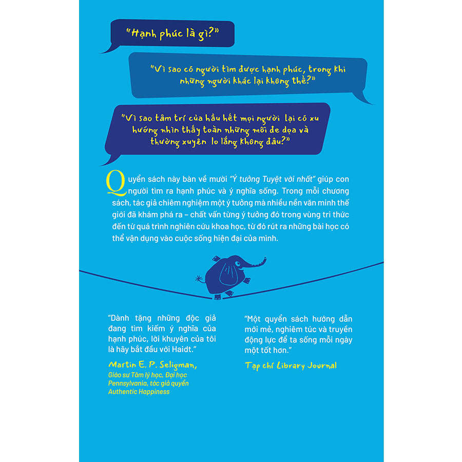 “Hạnh phúc là gì?” “Vì sao có người tìm được hạnh phúc, trong khi những người khác lại không thể?” “Vì sao tâm trí của hầu hết mọi người lại có xu hướng nhìn thấy toàn những mối đe dọa và thường xuyên lo lắng không đâu?” Quyển sách này bàn về “10 Ý Tưởng Tuyệt Vời Nhất” giúp con người tìm ra hạnh phúc và ý nghĩa sống. Trong mỗi chương sách, tác giả chiêm nghiệm một ý tưởng mà nhiều nền văn minh thế giới đã khám phá ra – chất vấn từng ý tưởng đó trong vùng tri thức đến từ quá trình nghiên cứu khoa học, từ đó rút ra những bài học có thể vận dụng vào cuộc sống hiện đại của mình. …… Hạnh phúc đến từ bên trong, và hạnh phúc cũng đến từ bên ngoài. Chúng ta cần sự dẫn dắt từ cả trí tuệ cổ đại lẫn khoa học hiện đại để có được sự cân bằng đúng đắn. “Ai cũng đã nghe qua “điều gì không giết được ta sẽ càng khiến ta mạnh mẽ hơn”, nhưng đó là một sự khái quát thái quá và nguy hiểm. Có rất nhiều thứ không giết chết bạn nhưng sẽ gây tổn hại cho bạn cả đời. Tại sao một số người tìm được ý nghĩa, mục đích, và sự viên mãn trong cuộc sống, còn những người khác lại không? Tôi cũng sẽ bàn đến việc mọi người thực chất muốn nói điều gì khi họ đặt ra câu hỏi: “Ý nghĩa cuộc sống là gì?”, và tôi sẽ đưa ra câu trả lời cho câu hỏi đó.” (Tác giả Jonathan Haidt)