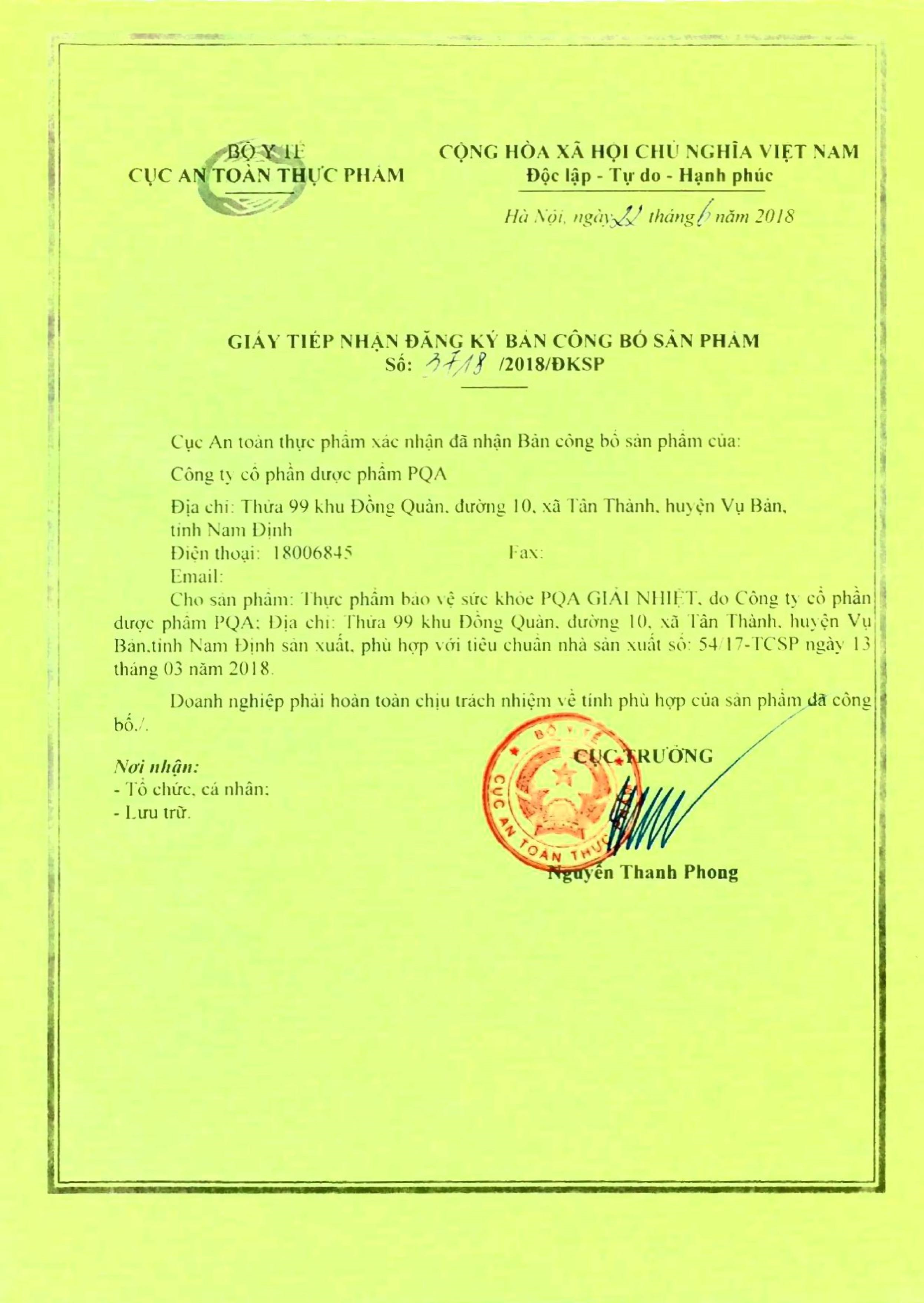 - Địa chỉ sản xuất: Công ty Cổ phần Dược phẩm PQA. Thửa 99, Khu Đồng Quàn, Xã Tân Thành, Huyện Vụ Bản, Tỉnh Nam Định. THÀNH PHẦN: