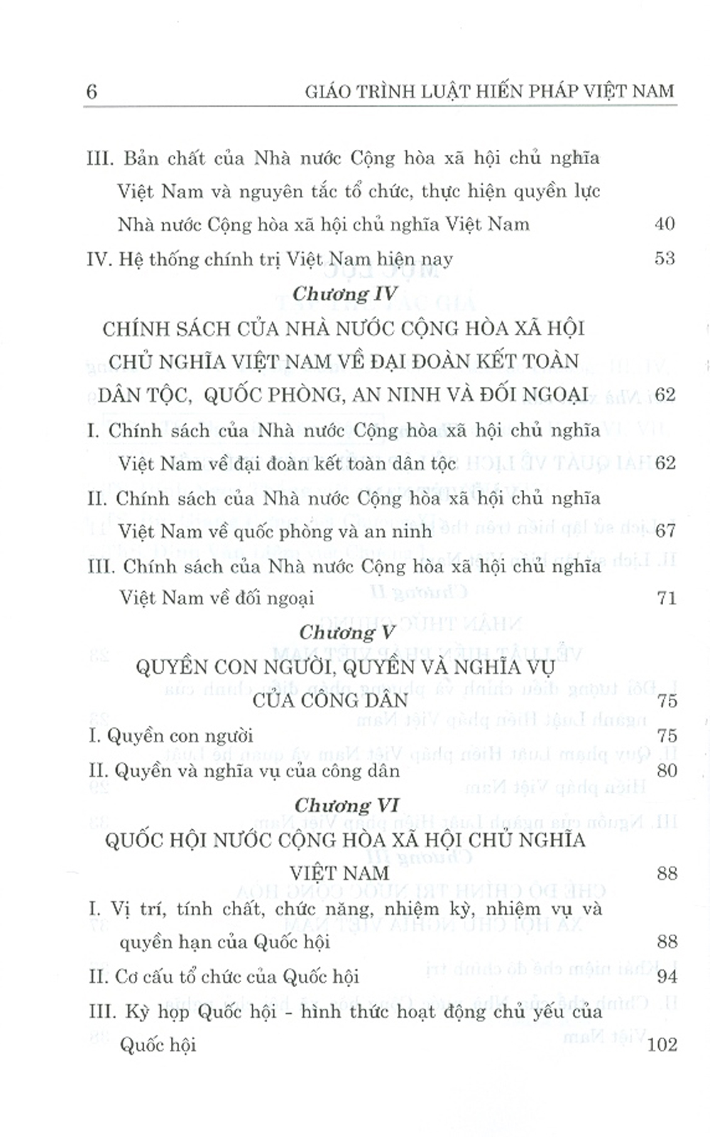 Chương 1: Những vấn đề cơ bản về luật hiến pháp. Chương 2: Hiến pháp và lịch sử lập hiến Việt Nam. Chương 3: Chế độ chính trị. Chương 4: Chế độ kinh tế. Chương