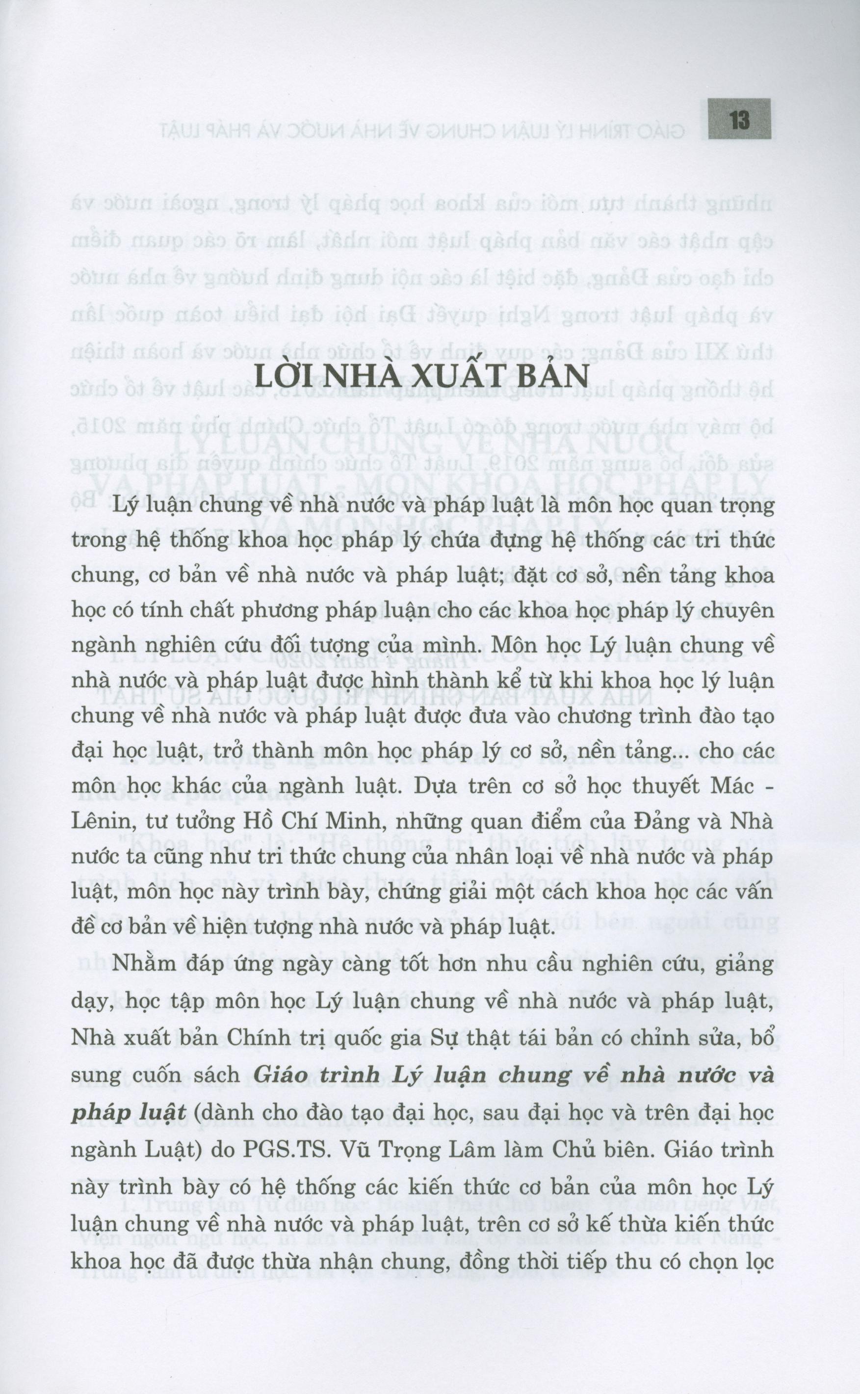 Nhằm đáp ứng ngày càng tốt hơn nhu cầu nghiên cứu, giảng dạy, học tập môn học Lý luận chung về nhà nước và pháp luật, Nhà xuất bản Chính trị quốc gia Sự thật tái bản có chỉnh sửa, bổ sung cuốn sách Giáo trình Lý luận chung về nhà nước và pháp luật (dành cho đào tạo đại học, sau đại học và trên đại học ngành Luật) do PGS.TS. Vũ Trọng Lâm làm Chủ biên. Giáo trình này trình bày có hệ thống các kiến thức cơ bản của môn học Lý luận chung về nhà nước và pháp luật, trên cơ sở kế thừa kiến thức khoa học đã được thừa nhận chung, đồng thời tiếp thu có chọn lọc