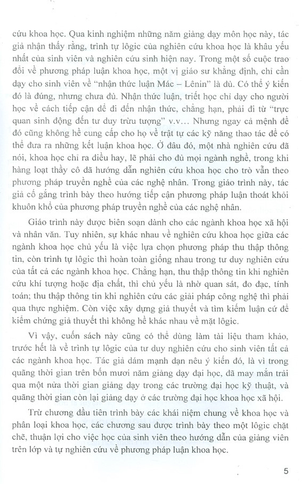 Giáo trình này được biên soạn dành cho các ngành khoa học xã hội và nhân văn. Tuy nhiên, sự khác nhau về nghiên cứu khoa học giữa các ngành khoa học chủ yếu là việc lựa chọn phương pháp thu thập thông tin, còn trình tự lôgic thì hoàn toàn giống nhau trong tư duy nghiên cứu của tất cả các ngành khoa học. Chẳng hạn, thu thập thông tin khi nghiên cứu khí tượng hoặc địa chất, thì chủ yếu là nhờ quan sát, đo đạc, tính toán; thu thập thông tin khi nghiên cứu các giải pháp công nghệ thì phải qua thực nghiệm. Còn việc xây dựng giả thuyết và tìm kiếm luận cứ để kiểm chứng giả thuyết thì không hề khác nhau về mặt lôgic.