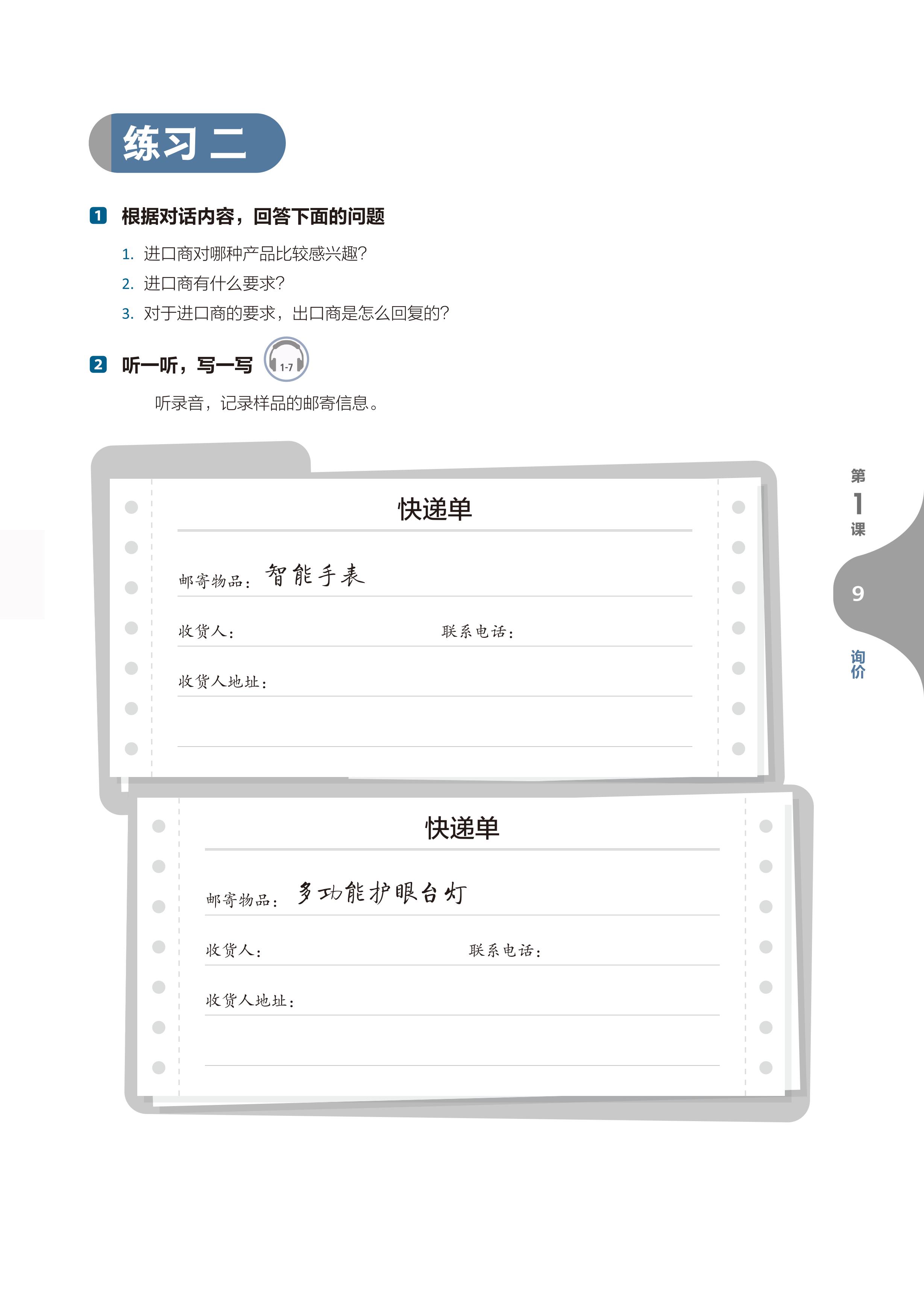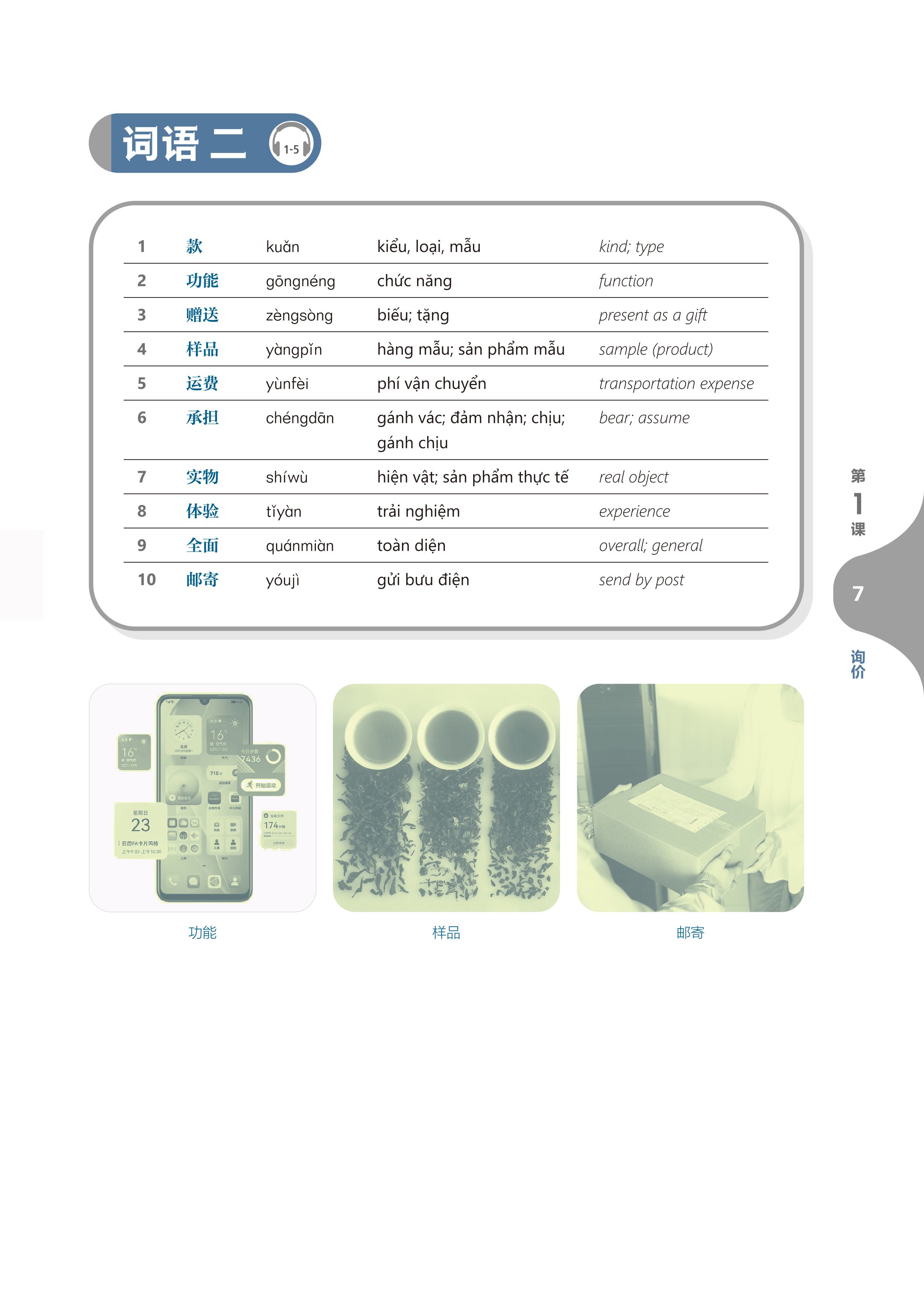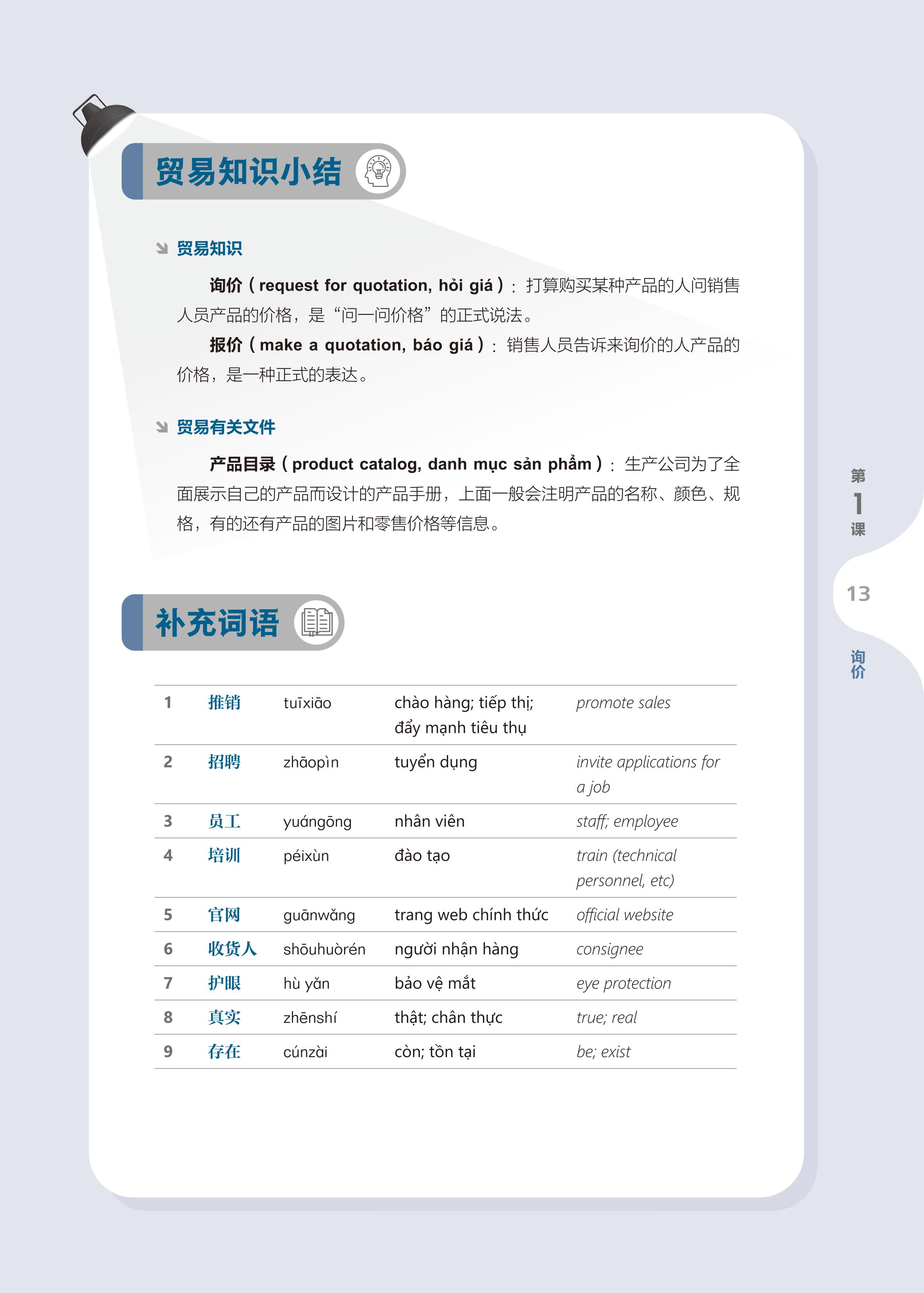 • Từ ngữ và Hội thoại: Nội dung cốt lõi của mỗi bài. Mỗi bài học hai đoạn hội thoại liên quan đến chủ đề bài học, thúc đẩy tình tiết câu chuyện phát triển, đồng thời nắm vững các từ ngữ trọng điểm liên quan, đặc biệt là các từ ngữ thường dùng trong môi trường kinh doanh.