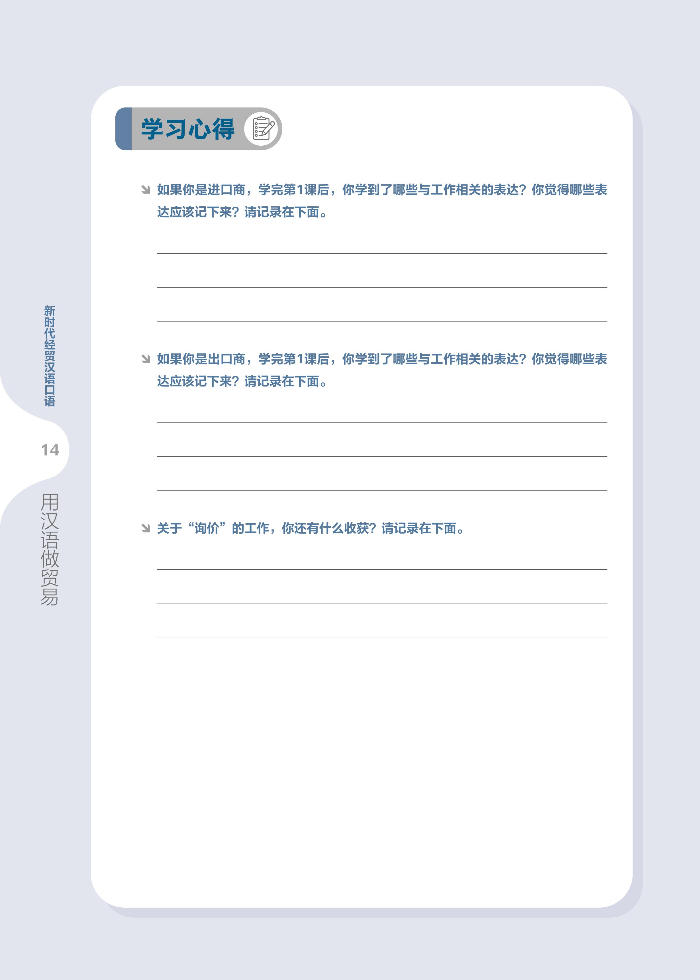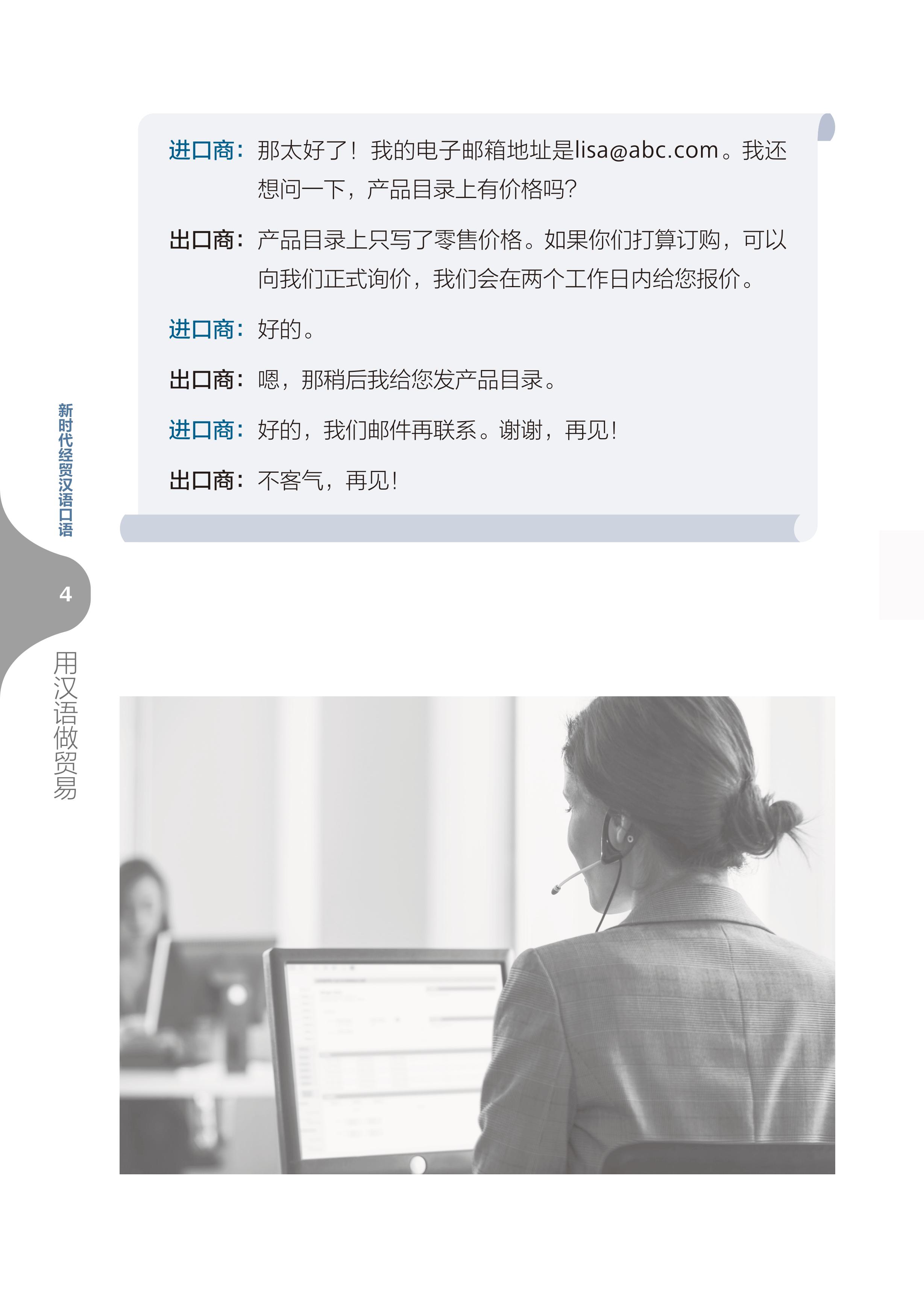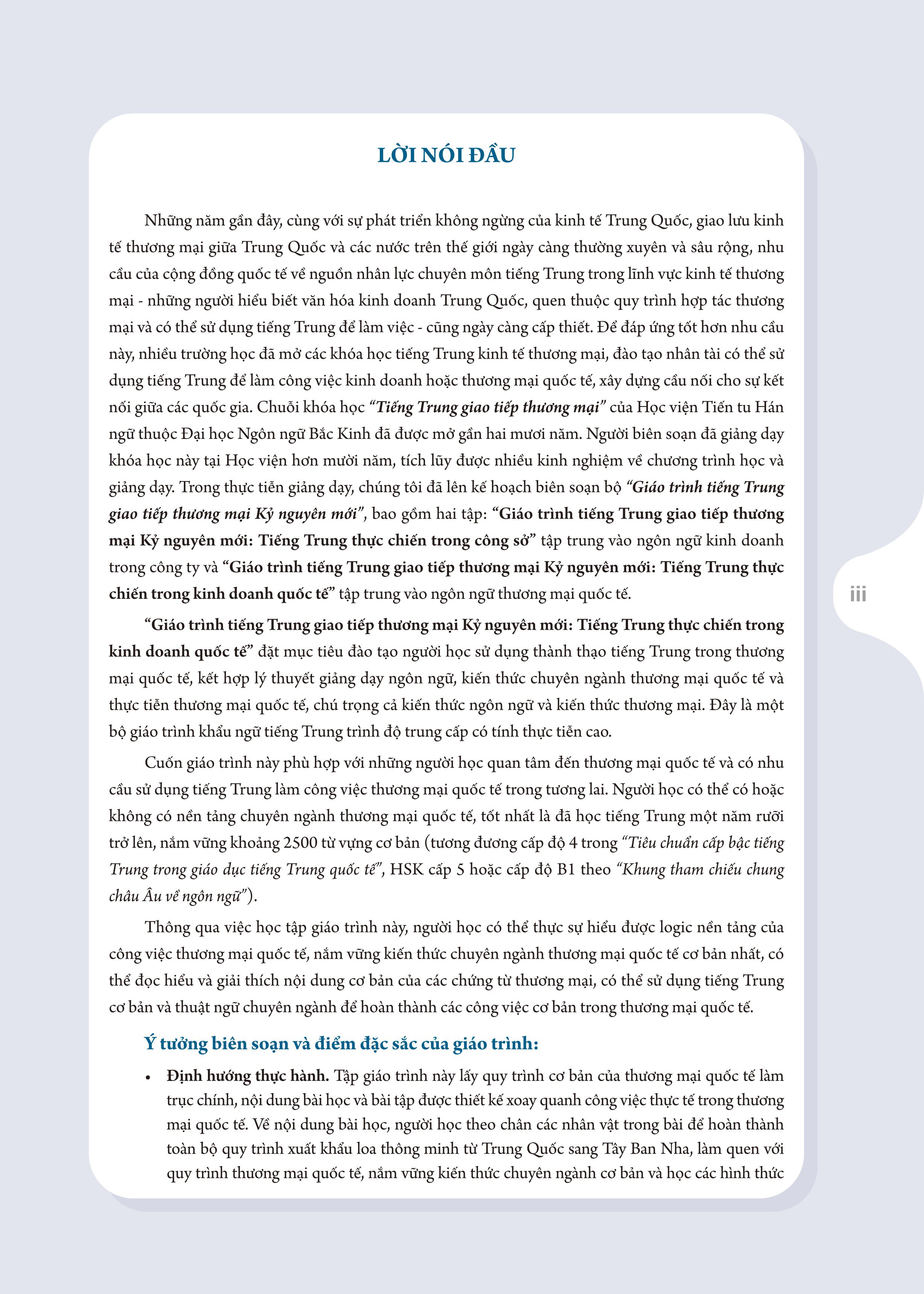 Những năm gần đây, cùng với sự phát triển không ngừng của kinh tế Trung Quốc, giao lưu giữa Trung Quốc và các nước trên thế giới trong lĩnh vực kinh tế thương mại ngày càng thường xuyên và sâu rộng, nhu cầu của cộng đồng quốc tế về nguồn nhân lực chuyên môn tiếng Trung trong lĩnh vực kinh tế thương mại - những người hiểu văn hóa kinh doanh Trung Quốc, quen thuộc với quy trình hợp tác thương mại và có thể sử dụng tiếng Trung để làm việc - cũng ngày càng cấp thiết. Để đáp ứng tốt hơn nhu cầu này, nhiều trường học đã mở các khóa học tiếng Trung kinh tế thương mại, đào tạo nhân tài có thể sử dụng tiếng Trung để làm công việc kinh doanh hoặc thương mại quốc tế, xây dựng cầu nối cho sự kết nối giữa các quốc gia. Chuỗi khóa học “Tiếng Trung giao tiếp thương mại” của Học viện Tiến tu Hán ngữ thuộc trường Đại học Ngôn ngữ Bắc Kinh đã được mở gần hai mươi năm, người biên soạn đã giảng dạy khóa học này tại Học viện hơn mười năm, tích lũy được nhiều kinh nghiệm về chương trình học và giảng dạy. Trong thực tiễn giảng dạy, chúng tôi đã lên kế hoạch biên soạn bộ “Giáo trình tiếng Trung giao tiếp thương mại Kỷ nguyên mới”, bao gồm hai tập: “Giáo trình tiếng Trung giao tiếp thương mại Kỷ nguyên mới: Tiếng Trung thực chiến trong công sở” tập trung vào ngôn ngữ kinh doanh trong công ty và “Giáo trình tiếng Trung giao tiếp thương mại Kỷ nguyên mới: Tiếng Trung thực chiến trong kinh doanh quốc tế” tập trung vào ngôn ngữ thương mại quốc tế.