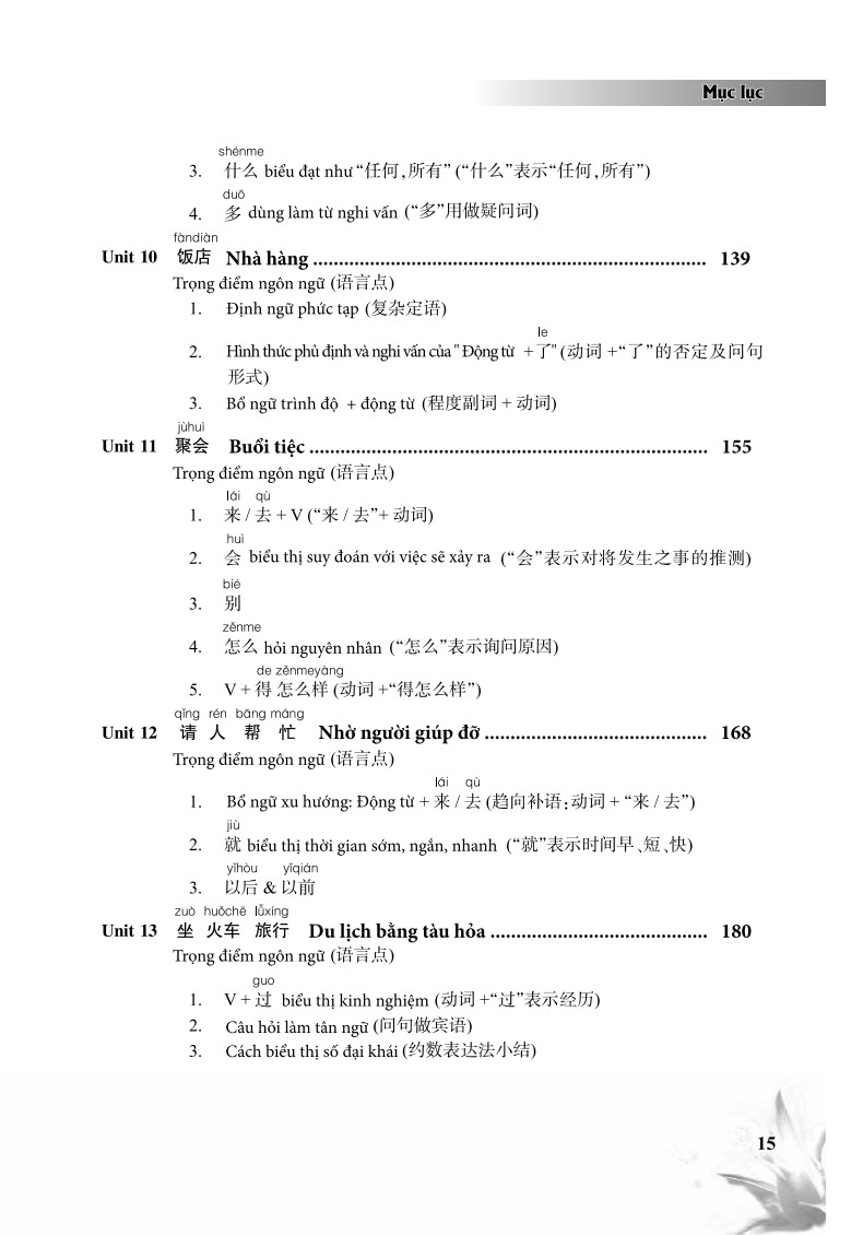 Cuốn sách Giáo Trình Tiếng Trung Giao Tiếp Tổng Hợp Dành Cho Người Việt Nam có 15 bài, mỗi bài gồm: