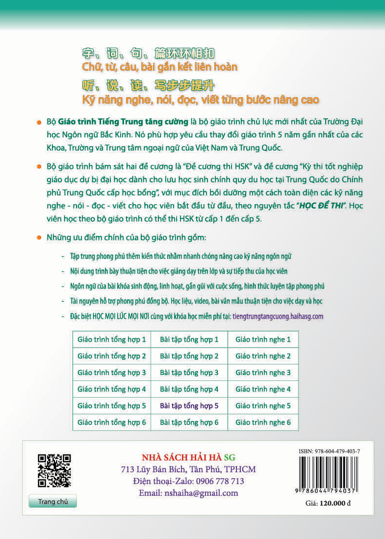 Bộ Giáo trình Tiếng Trung tăng cường là bộ giáo trình chủ lực mới nhất của Trường Đại học Ngôn ngữ Bắc Kinh. Nó phù hợp yêu cầu thay đổi giáo trình 5 năm gần nhất của các Khoa, Trường và Trung tâm ngoại ngữ của Việt Nam và Trung Quốc.