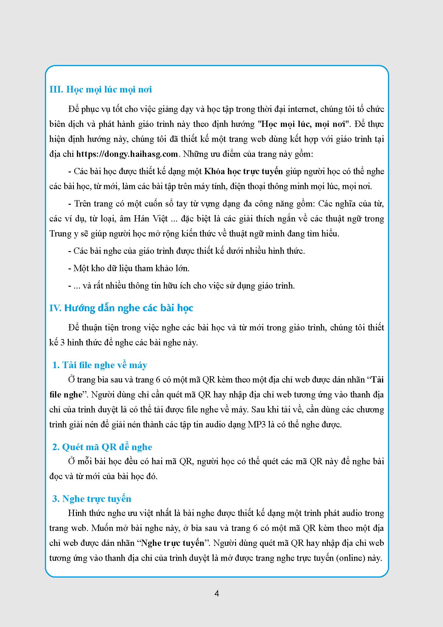 Quyển sách được biên soạn theo nguyên tắc học sinh tự học là chính, giáo viên giảng dạy là phụ, thể hiện quan niệm dạy học lấy người học làm trung tâm. Người học có thể học mọi lúc mọi nơi thông qua 3 hình thức nghe trong sách, và tham gia khóa học online trên trang web của nhà sách Hải Hà. Đây là nỗ lực của nhà sách chúng tôi nhằm mang đến cho người học trải nghiệm tốt nhất và thuận tiện nhất khi đến với nhà sách.