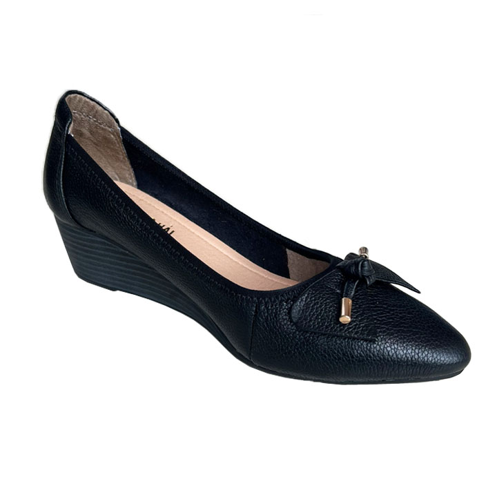 - Giày nữ mũi nhọn Đế Xuồng 5cm Da Bò đính nơ xinh xắn Màu Đen Trường Hải DX117Đ Hàng gia công đường may chắc chắn, Dáng form ôm gọn đôi chân