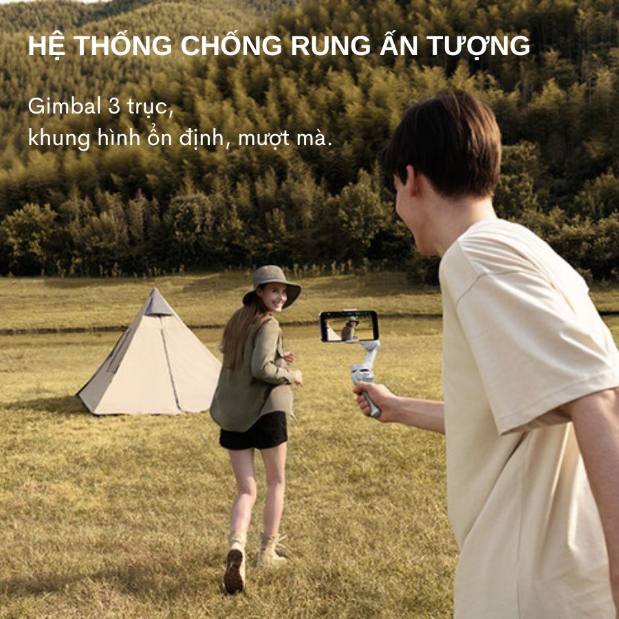 - Những chế độ quay video ấn tượng khác Nhằm tăng độ thú vị trong từng trải nghiệm, kích thích sức sáng tạo không giới hạn của người dùng, gimbal DJI Osmo Mobile SE tích hợp rất nhiều chế độ quay video độc đáo, nổi trội khác. 6.1 DynamicZoom Với thao tác điều chỉnh thanh trượt thu phóng để "di chuyển gimbal vào gần" hoặc "di chuyển gimbal ra xa", chế độ DynamicZoom lúc này sẽ cho ra hiệu ứng phóng to, thu nhỏ, nén hay kéo dãn hình ảnh vừa lạ mắt vừa thú vị, tạo cảm giác độ sâu cho khung hình của bạn. 6.2 Panorama Đây sẽ là chế độ giúp người dùng thu trọn tầm mắt của không gian xung quanh nằm gọn trong một khung hình. Đặc biệt, DJI Osmo SE hỗ trợ cả tính năng Panorama Clone Me, cho phép bạn có thể tạo ra nhiều phiên bản của chính mình hoặc chủ thể khác xuất hiệu ở nhiều vị trí trong 1 bức hình, tạo ra hiệu ứng 3 chiều vô cùng sáng tạo, độc đáo. 6.3 Story Mode Chế độ Story Mode đi kèm cùng rất nhiều mẫu template khác nhau với các chuyển động máy ảnh, chuyển tiếp, nhạc, tăng hiệu ứng cho video người dùng, từ đó sẵn sàng chia sẻ video của mình lên mạng xã hội chỉ bằng 1 lần chạm. Ngoài ra, bạn cũng có thể tự tạo ra những mẫu template có 1-0-2 của riêng mình. 6.4 Gesture Control Một trong những tính năng đáng giá trên DJI OM SE đó chính là khả năng điều khiển bằng cử chỉ tay. Ra ký hiệu để kích hoạt tính năng quay chụp của máy từ xa, đảm bảo khung hình xuất hiện đầy đủ mọi thành viên, hay ra hiệu để máy tự quay khi xung quanh không có ai hỗ trợ cũng chỉ với một cử chỉ tay đơn giản, vô cùng thuận tiện, hữu ích. 6.5 Hỗ trợ quay ngang, dọc Nếu đã quen thuộc với định dạng quay ngang thì với gimbal DJI OM SE giờ đây, người dùng có thể chuyển đổi sang quay chế độ dọc, phù hợp cho các nhà sáng tạo có thể quay nội dung ngắn như Reelss, TikkTokk, Youtubeee Shorts,... chuyên nghiệp, hình ảnh mượt mà ngay trên chiếc điện thoại của mình. Với thao tác điều chỉnh thanh trượt thu phóng để "di chuyển gimbal vào gần" hoặc "di chuyển gimbal ra xa", chế độ DynamicZoom lúc này sẽ cho ra hiệu ứng phóng to, thu nhỏ, nén hay kéo dãn hình ảnh vừa lạ mắt vừa thú vị, tạo cảm giác độ sâu cho khung hình của bạn. 6.6 Panorama Đây sẽ là chế độ giúp người dùng thu trọn tầm mắt của không gian xung quanh nằm gọn trong một khung hình. Đặc biệt, DJI Osmo SE hỗ trợ cả tính năng Panorama Clone Me, cho phép bạn có thể tạo ra nhiều phiên bản của chính mình hoặc chủ thể khác xuất hiệu ở nhiều vị trí trong 1 bức hình, tạo ra hiệu ứng 3 chiều vô cùng sáng tạo, độc đáo. 6.7 Story Mode Chế độ Story Mode đi kèm cùng rất nhiều mẫu template khác nhau với các chuyển động máy ảnh, chuyển tiếp, nhạc, tăng hiệu ứng cho video người dùng, từ đó sẵn sàng chia sẻ video của mình bằng 1 lần chạm. Ngoài ra, bạn cũng có thể tự tạo ra những mẫu template có 1-0-2 của riêng mình. 6.8 Gesture Control Một trong những tính năng đáng giá trên DJI OM SE đó chính là khả năng điều khiển bằng cử chỉ tay. Ra ký hiệu để kích hoạt tính năng quay chụp của máy từ xa, đảm bảo khung hình xuất hiện đầy đủ mọi thành viên, hay ra hiệu để máy tự quay khi xung quanh không có ai hỗ trợ cũng chỉ với một cử chỉ tay đơn giản, vô cùng thuận tiện, hữu ích.