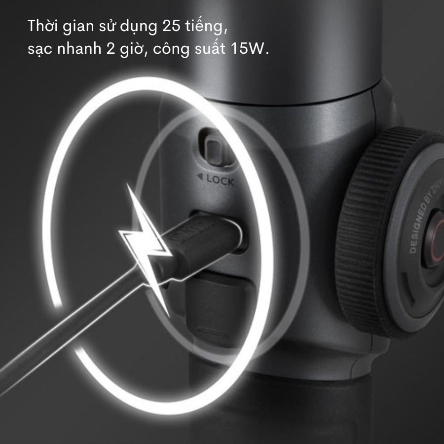 - Thời gian quay phim vượt trội Khi kết nối điện thoại di động lên gimbal thì bạn có thể sử dụng Zhiyun Smooth 5S trong khoảng thời gian lên đến 25 tiếng. Thỏa sức sáng tạo những thước phim chuyên nghiệp và đẳng cấp. Đặc biệt, gimbal còn cho phép người dùng sạc nhanh trong vòng 2 giờ khi sử dụng bộ sạc nhanh 15W để không bỏ lỡ bất kì cảnh quay thú vị nào. Hỗ trợ sạc nhanh