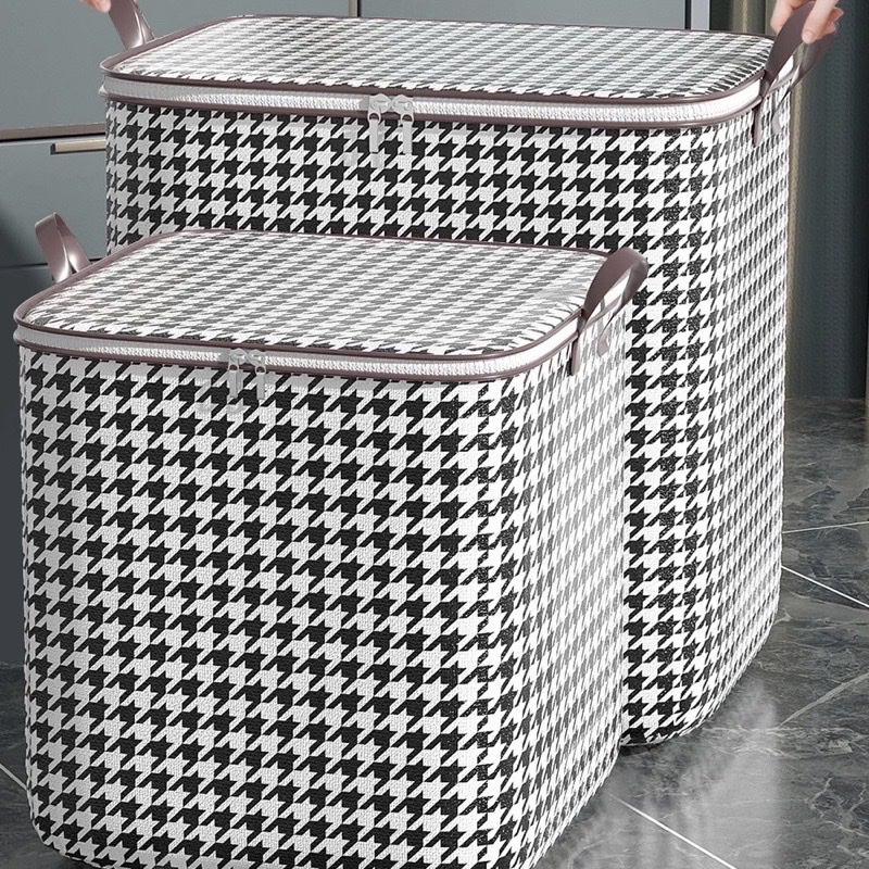 -Giỏ đựng chăn màng quần áo đa năng , họa tiết caro sọc trắng đen cao cấp ,có dây kéo ,quai cầm giúp tiện lợi trong việc cầm , xách di chuyển tiết kiệm không