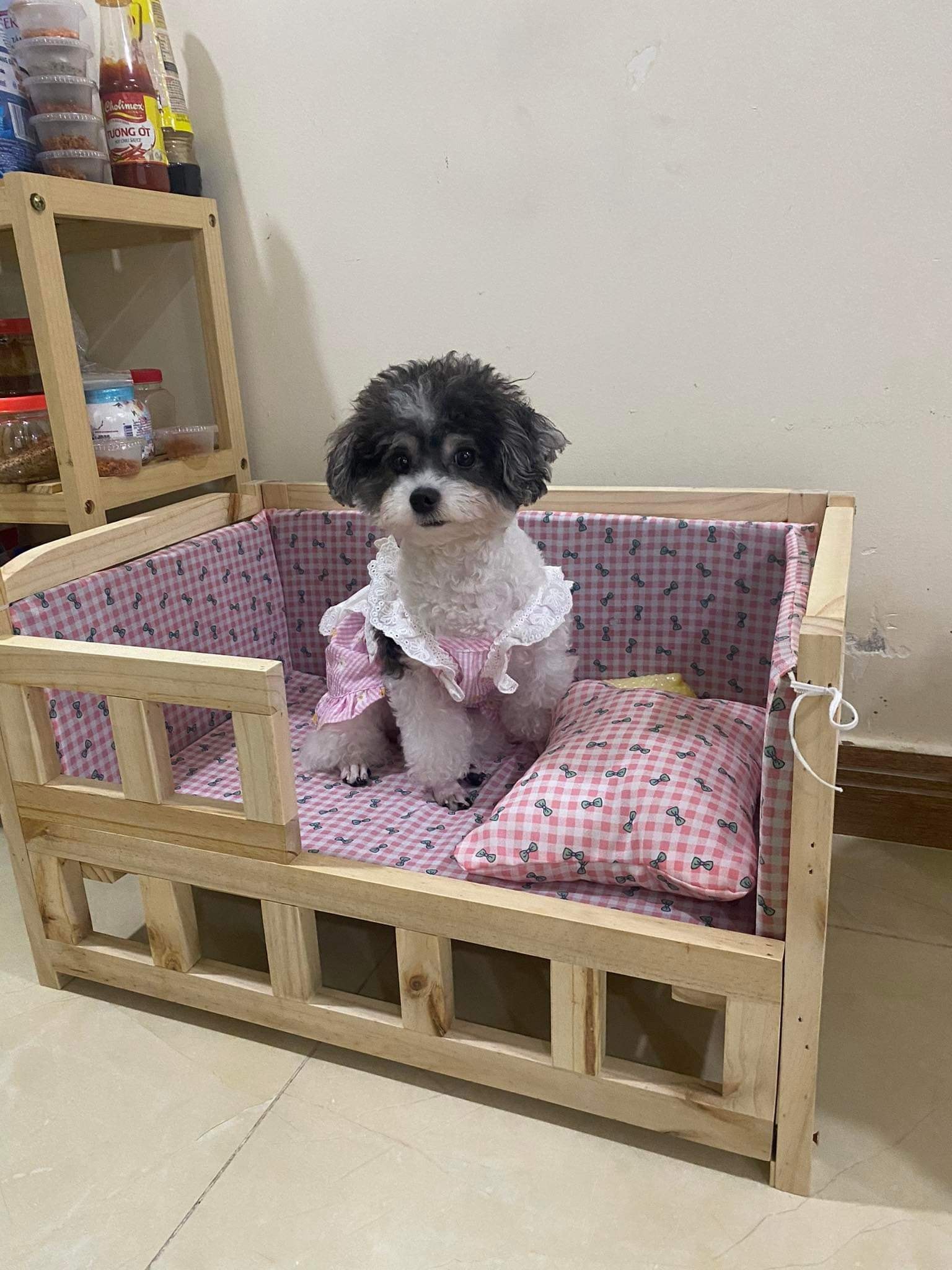 Lều ngủ cho thú cưng kèm khung gỗ & rèm và đệm nhồi bông ấm áp Kích thước: 65*45*75cm (phù hợp cho bé 10 kg trở xuống) tạo ra một không gian đủ rộng cho