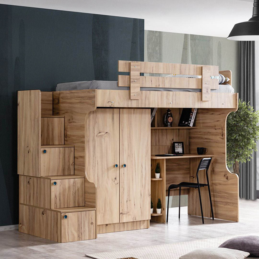 Giường tầng xuất khẩu Derry có kích thước lọt lòng giường trên/dưới là 100x193 cm, phủ bì 202x110x165 cm. Khoảng cách giữa 2 tầng là 95 cm, cầu thang bố trí bên phải. Chân trụ