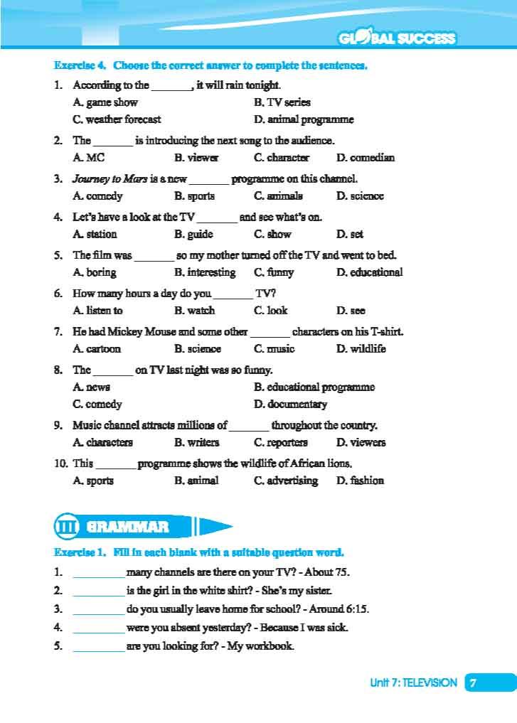 Global Success - Bài Tập Tiếng Anh Lớp 7 - Tập 1 (Có Đáp Án) (Tái Bản) Với mong muốn giúp các em học sinh đầu cấp củng cố và mở rộng kiến thức ngôn
