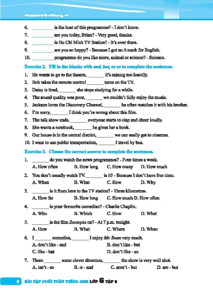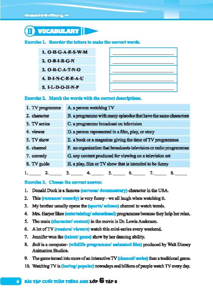 - Phần bài tập cơ bản: được thiết kế để giúp các em củng cố và hiếu sâu hơn về kiến thức tiếng Anh được học trong từng đơn vị bài học trên lớp. Các bài tập ở phần này giúp các em áp dụng những kiến thức đã học vào các tình huống thực tế, từ vựng, ngữ pháp đến rèn luyện các kĩ năng đọc, viết, giao tiếp.