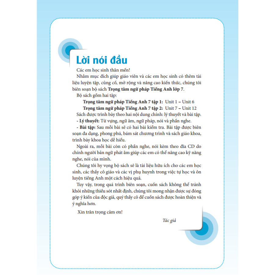Mua tại TiktokNhằm mục đích giúp giáo viên và các em học sinh có thêm tài liệu luyện tập, củng cố, mở rộng và nâng cao kiến thức, chúng tôi biên soạn bộ sách Trọng tâm ngữ pháp Tiếng Anh lớp 7.