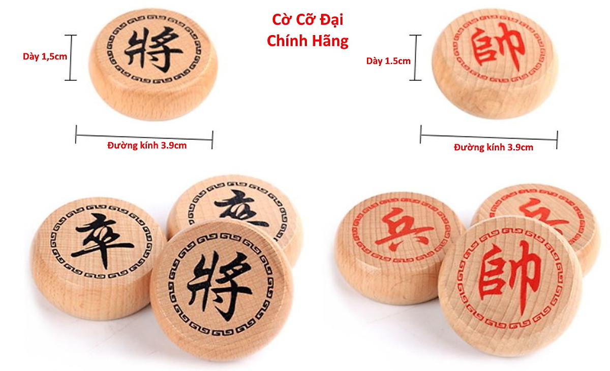 - Cỡ Đại với quân cờ đường kính 3,9cm dày 1,5cm.